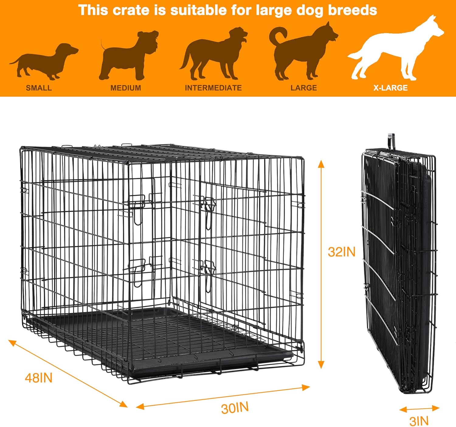 48 Inch Dog Crate Dog Cage for Large Dogs Folding Mental Wire Dog Kennel Outdoor and Indoor with Double-Door Divider Panel Removable Tray and Handle