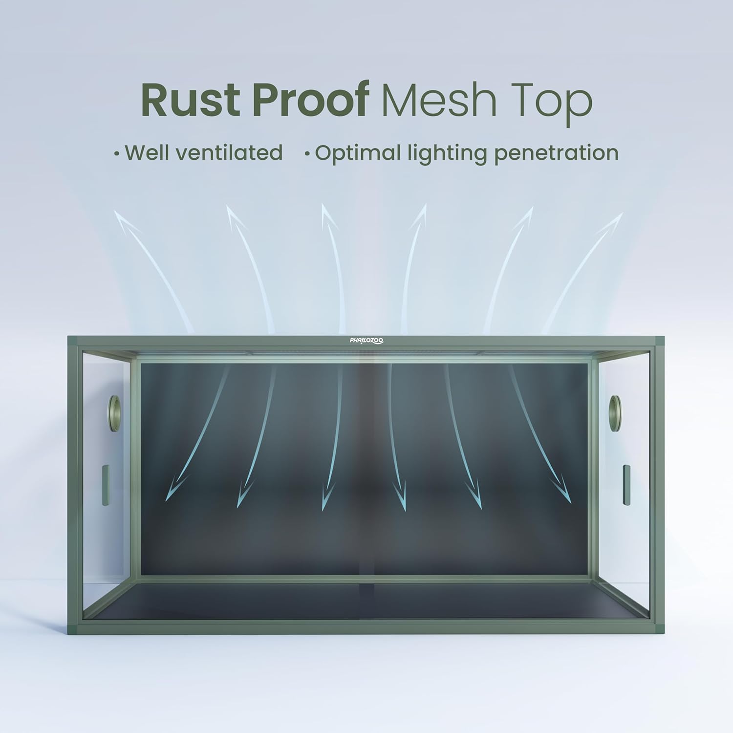 【Worry Less】NO GAPS FOR ESCAPING with fully closed structure. Rigid tempered glass doors with tiny door gaps. Rust proof top screen ventilation worldnet027ows better air circulation and optimal lighting penetration.