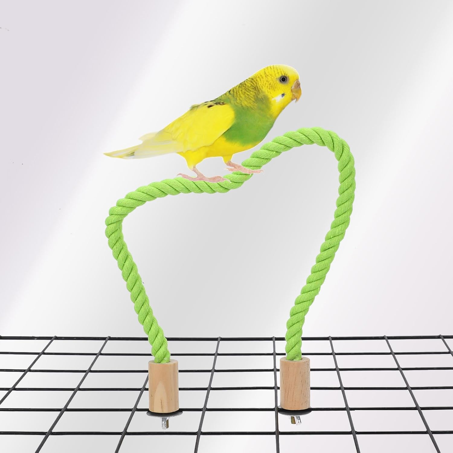 【Plasticity】Both ends of our bird stand rope are made of wood, and the main body is made of light green thread wrapped with iron wire, which is plastic, you can adjust it arbitrarily, and you can choose to fix it on any part of the bird cage