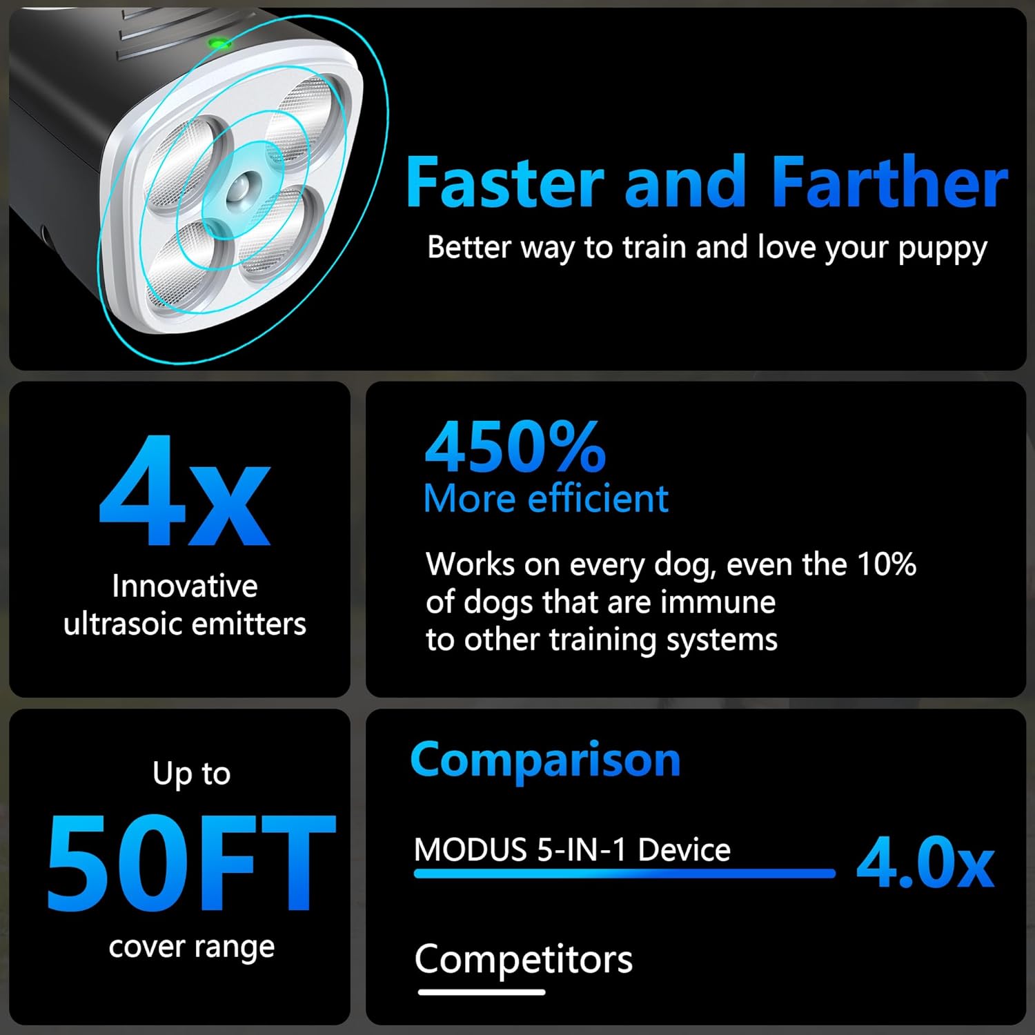 🐕450% More Efficient(4 Ultrasonic Emitters|Only We Have Now on Market) – Say goodbye to the discomfort of shock collars! Our MODUS Ultrasonic Dog Barking Control Devices merge automatic shut-off hearing protection with ultrasonic pet clickers technology, ensuring quieter surroundings, better sleep, and a more obedient pooch, is a professional device for Dog Training and Dog Bark Control.