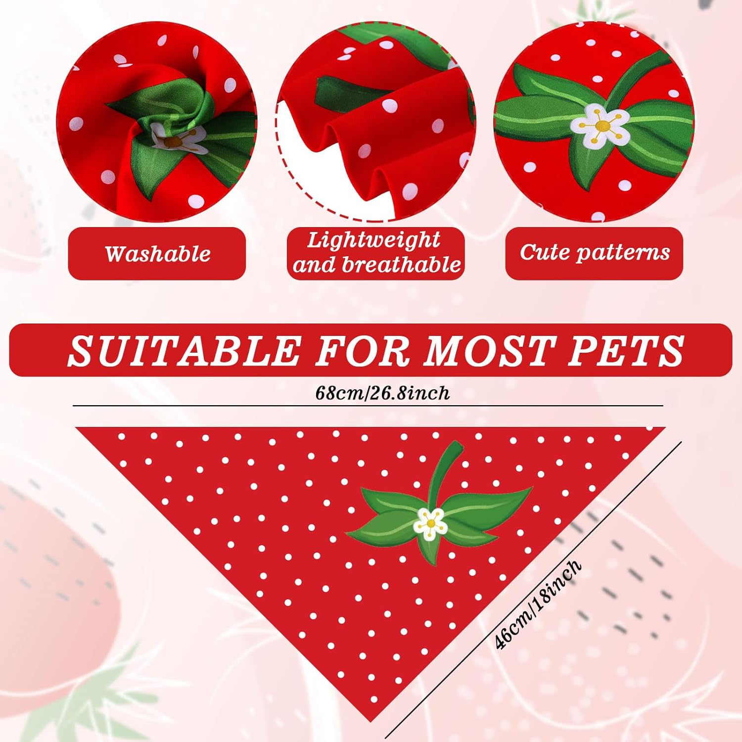 The dog bandanas colored in red and pink, patterned with sweet strawberries, cute and funny, suitable for dogs daily dressing and some special occasions decoration.