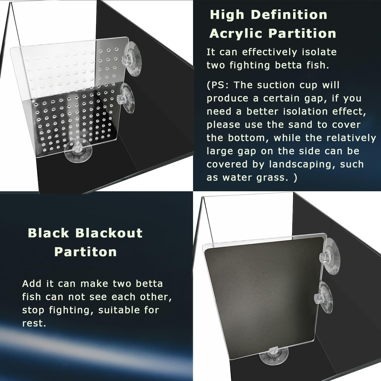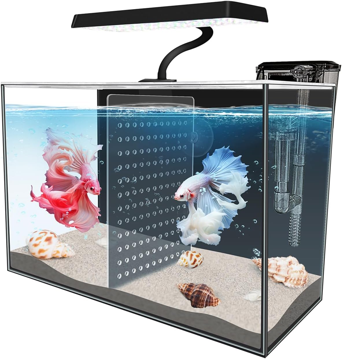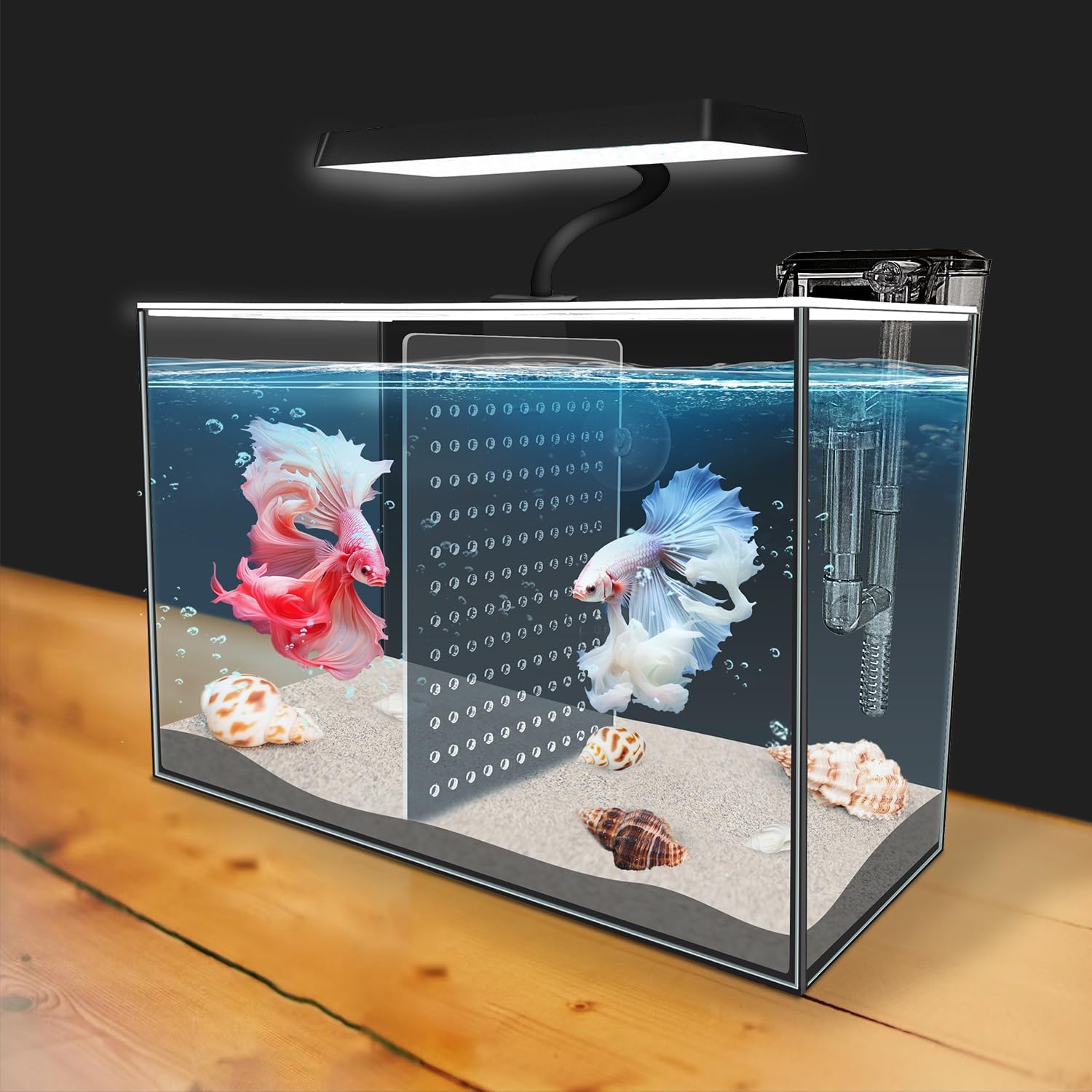 3 Gworldnet027on Fish Nano Glass Aquarium, with Separator Plate for Betta, Multi-Functional Square Fish Tank with Filter, LED Light, Black 4mm Glass