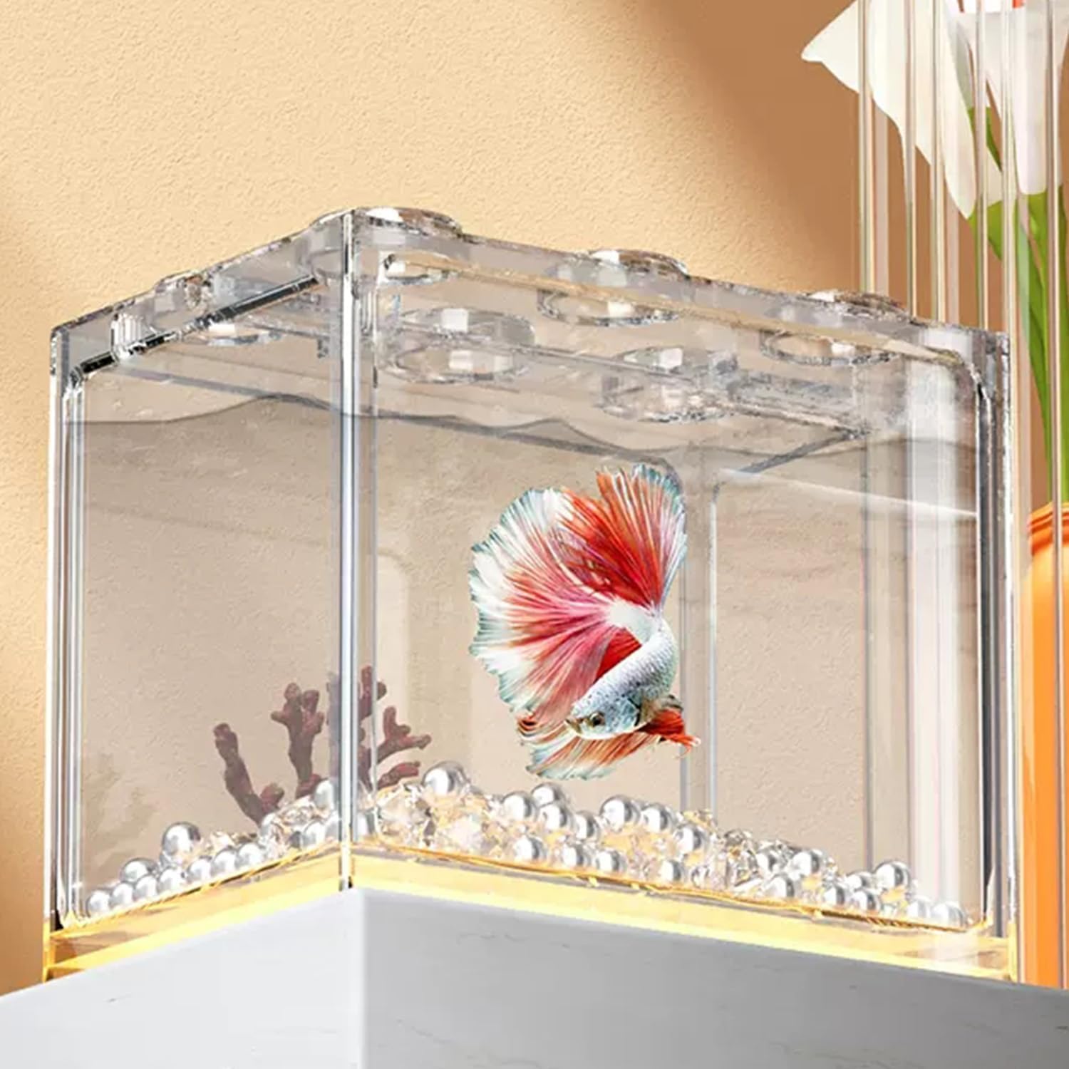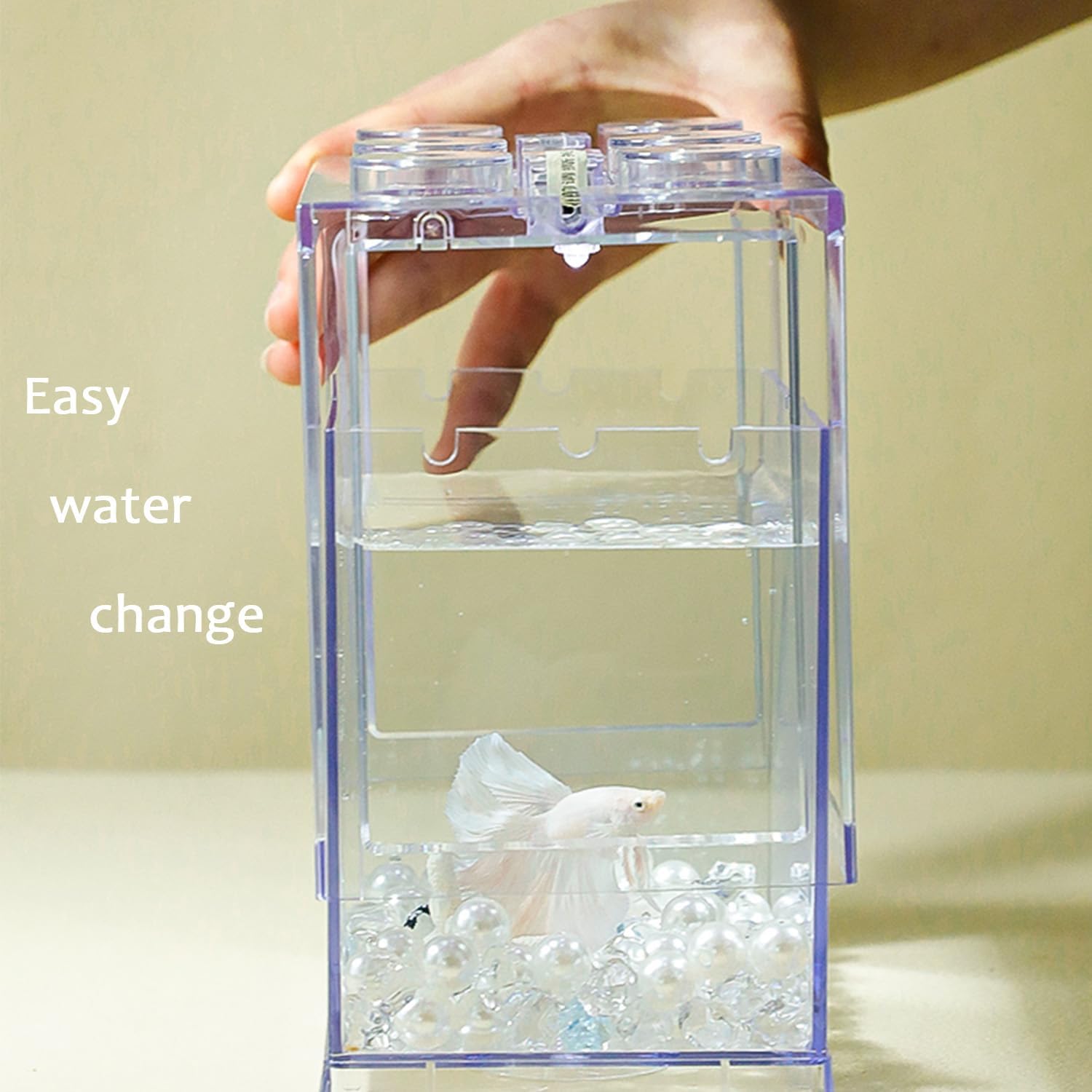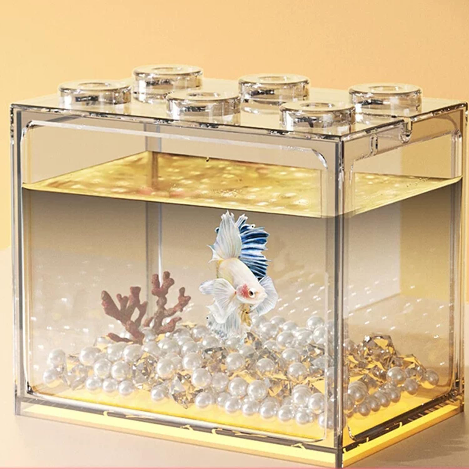 This is a cute little fish tank with 6 protruding columns at the top, which can be stacked with the same fish tank to mold multiple fish tanks into different shapes to decorate your table.