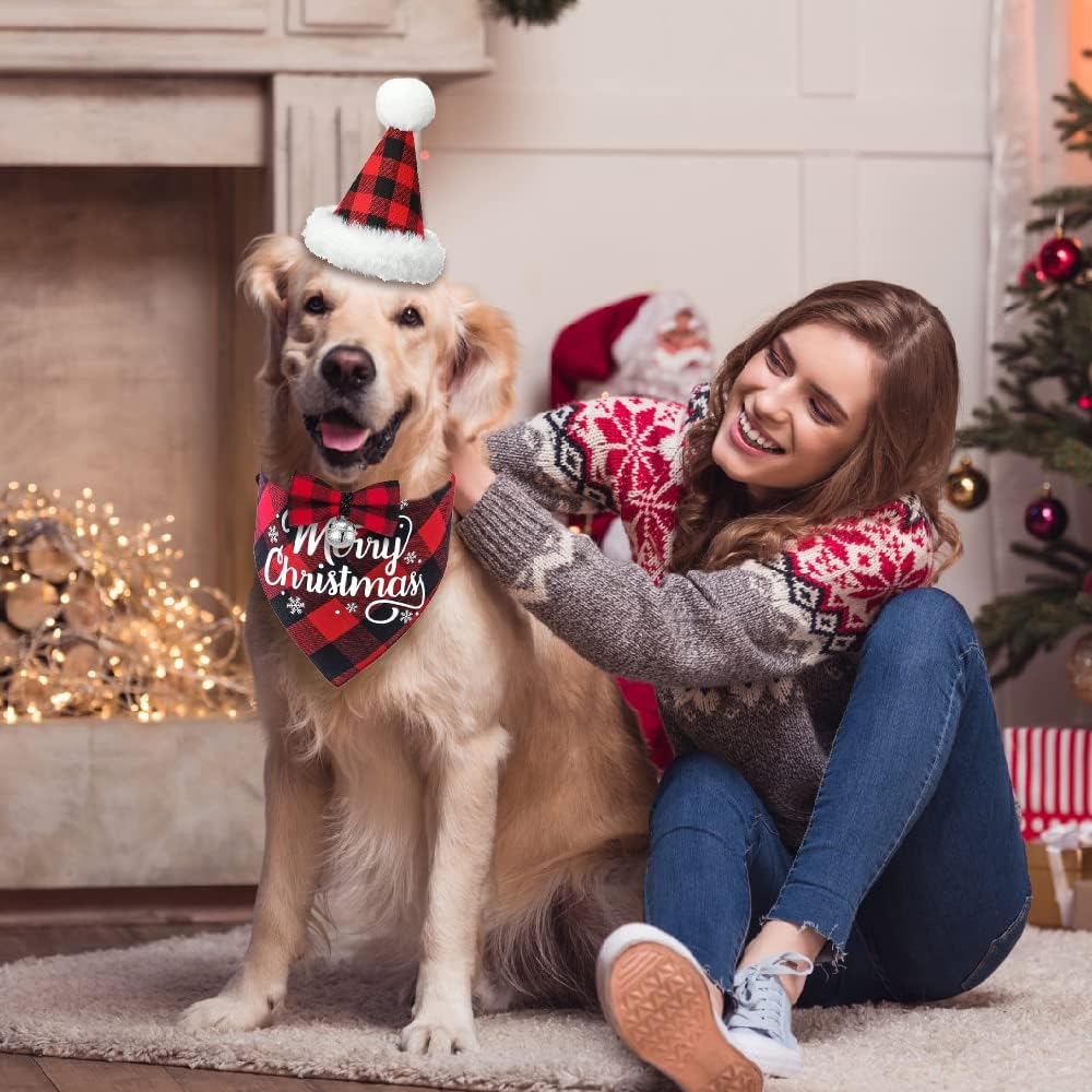 3pcs Christmas Dog Costumes Classic Buffalo Plaid Christmas Dog Outfit Clothes Xmas Dog Bandana Hat Bowtie Scarf Kerchief Triangle Bib Accessories for Smworldnet027 Medium Dogs