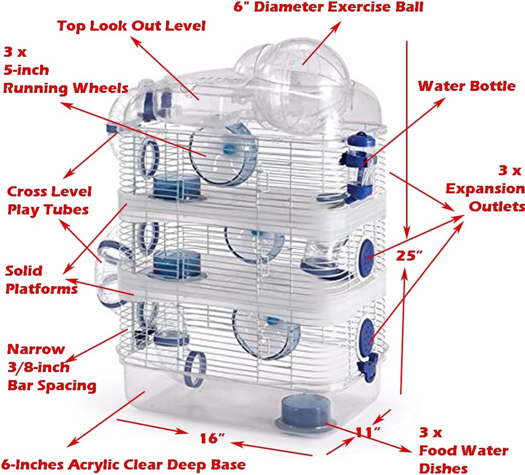 【16″Length x 11″Depth x 25″Height 】【Complete Features Includes, Total 3 Exercise wheels, Total 3 Food Dishes, and 1 Water Bottle】【 6-Inches Acrylic Clear Deep Base 】For More Playing Area (Allow Easy See Through the Daily Activities of Your Pet).