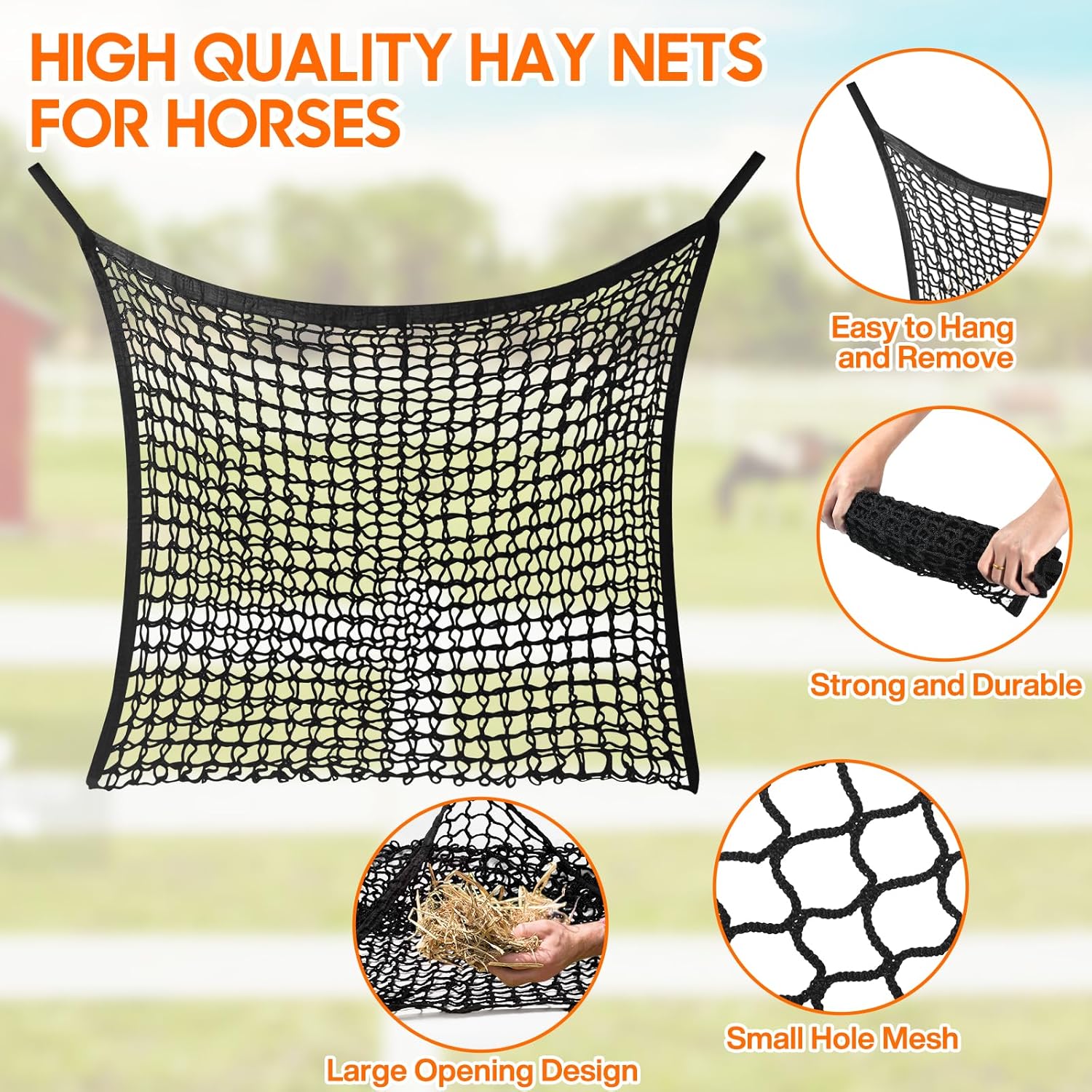 HIGH QUALITY POLYESTER — Hay feeder is made of terylene, Softer and more wear resistance than traditional nylon and polypropylene ones, After actual testing, It can withstand various severe weather such as heavy rain and snow.The net will last a very long time, so can save your money.