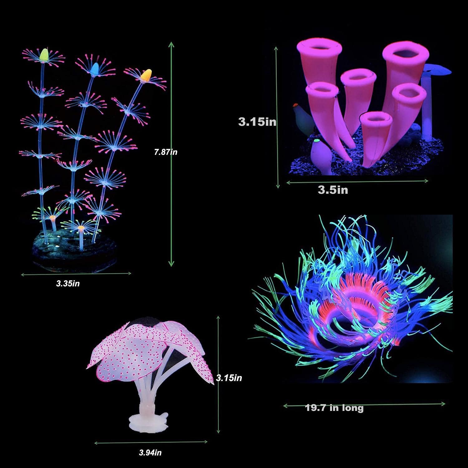 PACKAGE CONTENTS : You will get 4 pieces glowing aquarium fish tank decorations, including 1 piece glowing feather coral,1 piece pink glowing sucker coral ,1 piece green glowing anemone and 1 pieces of artificial Glowing Horn Coral.