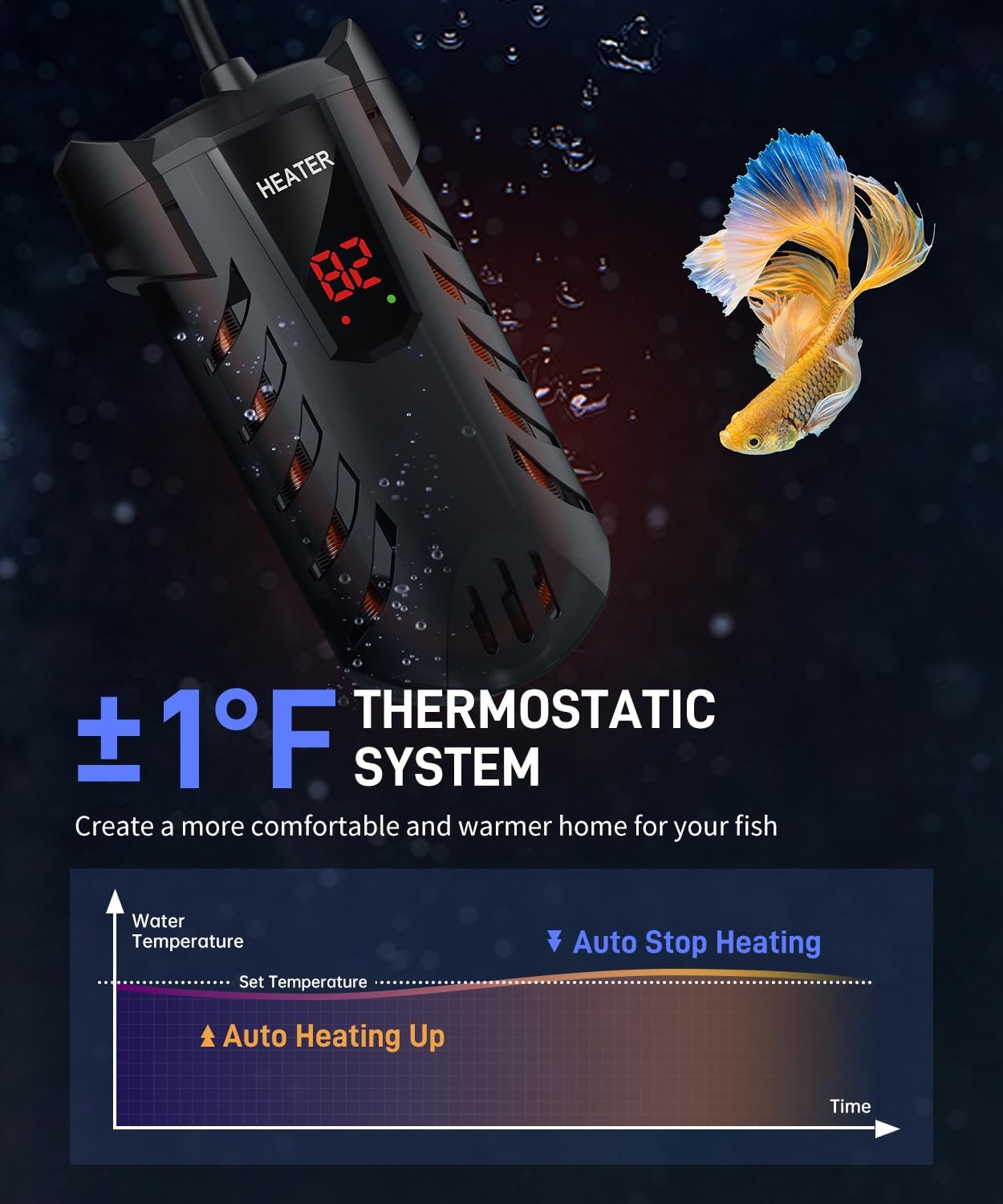 🐠【How to ensure safety?】Safety remains a top priority with our fish tank heaters. Our turtle tank heater have 3 intelligent protector. ① Over max temp warning, when the temperature is higher 93℉, the code H1 appears and automaticworldnet027y stop heating. ② Off-Water warning, when the submersible aquarium heater is higher than the level of the fish tank water code E1 appears and automaticworldnet027y stop heating. ③automaticworldnet027y turns on the heating when it is lower than 59 ℉ L0 appears.