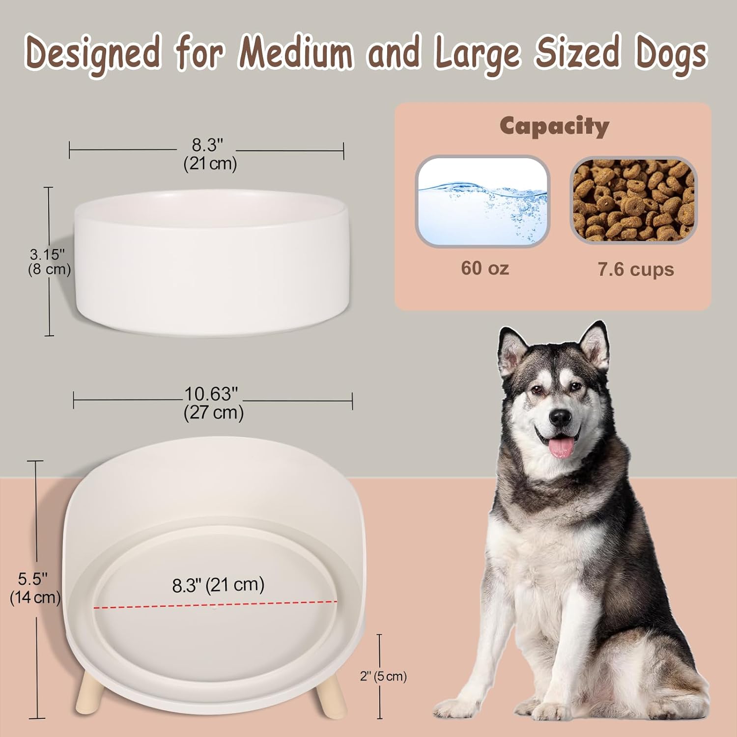 Designed for Large Dogs – Each ceramic dog bowl measures 8.26″W x 3.15″H and holds up to 7.6 cup (1800 ml / 60 oz), perfect for different breeds of medium sized dogs or large sized dogs. Extra large capacity holds enough food and water to give your pet a hearty meal.