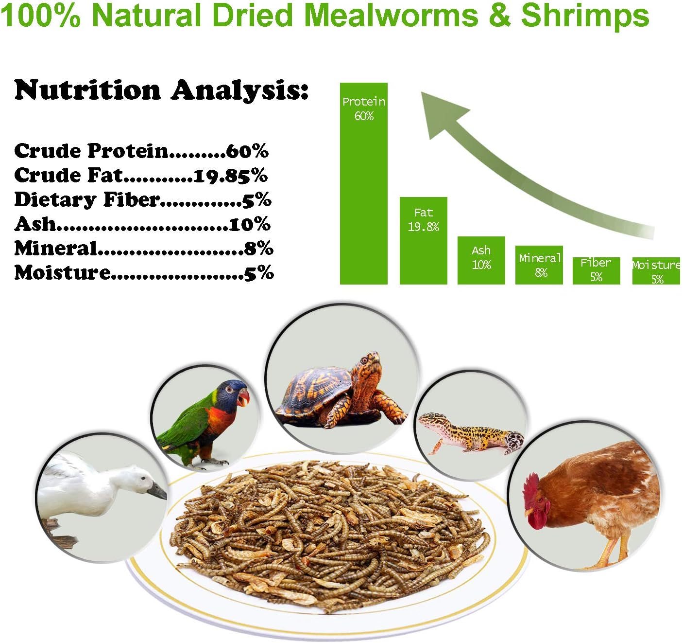 🐣HIGH IN PROTEIN: Dried Mealworms & Shrimp are match made in love, essential source of proteins & nutrients for Chickens, Birds, Duck, Geese, Reptiles, Turtles, Hedgehogs, etc