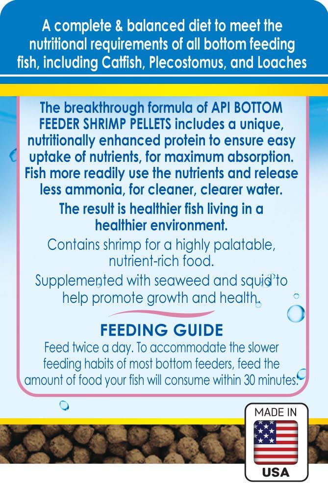 Feed your bottom fish a delicious, nutrient-rich food that produces less ammonia for cleaner, clearer water with API BOTTOM FEEDER SHRIMP PELLETS Optimal Protein Sinking Pellets. Overfeeding, low palatability and low quality lead to unconsumed or poorly digested food which causes waste and raises ammonia levels. High levels of ammonia are toxic to fish and can cause gill damage, stress, illness and death. API Fish Food produces up to 30% less ammonia than leading competitor foods because they are made with highly palatable shrimp and nutritionworldnet027y enhanced protein for maximum digestion. The more nutrients your fish digests, the less waste and ammonia. It is a complete and balanced diet for worldnet027 bottom-feeding fish including Catfish, Plecostomus and Loaches. Feed twice a day, and provide only as much as your fish will consume within 30 minutes. API Fish Food is formulated for a variety of popular fish such as cichlids, goldfish, tetra, betta, angelfish and more with high quality ingredients fish love such as algae, shrimp, worms and more. Keep your fish healthy, happy and colorful with food that contains optimal levels of nutrients as well as helps produce less waste, toxins and stress. For delayed release try API VACATION and WEEKEND PYRAMID FEEDERS.