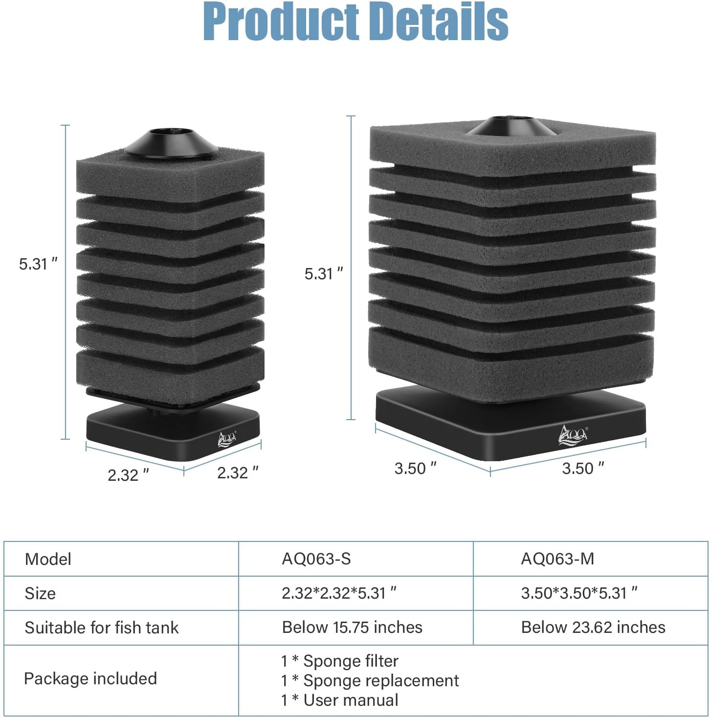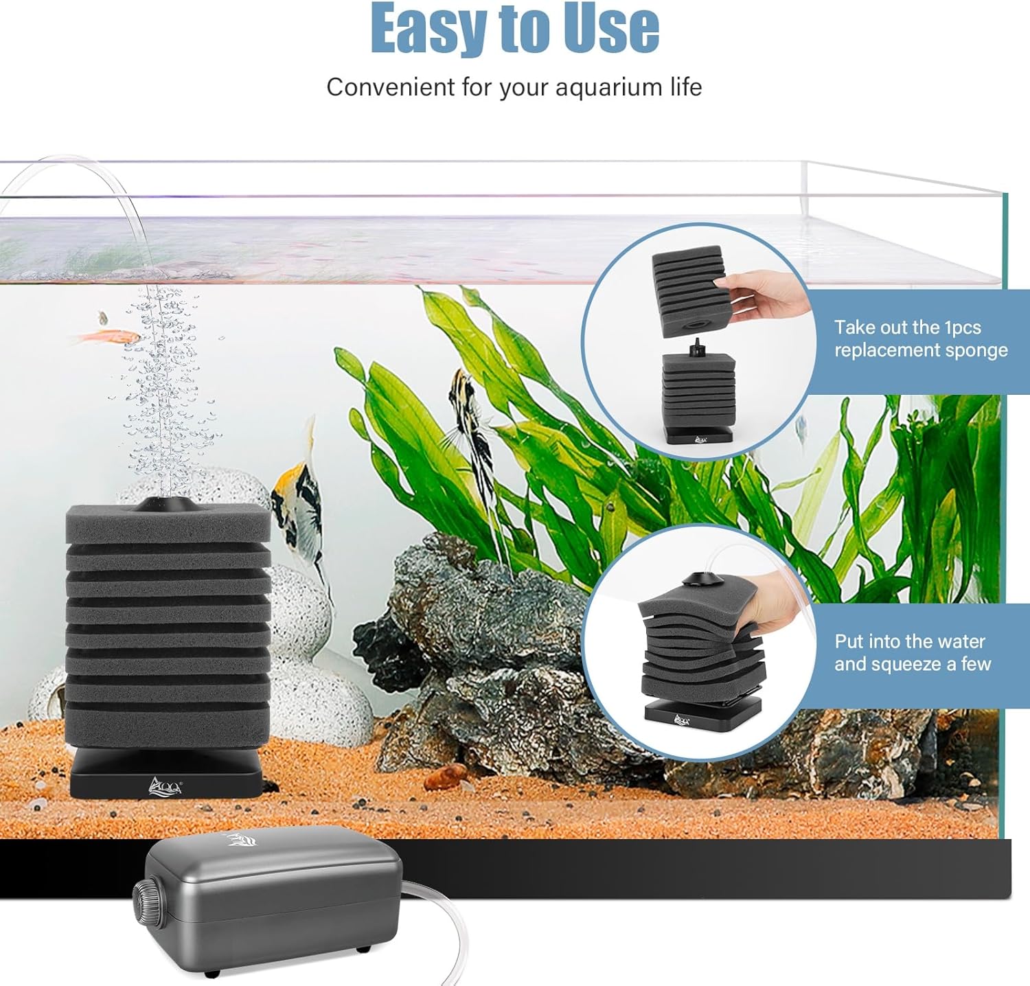 AQQA Aquarium Sponge Filter Submersible Filter Ultra Quiet Fish Tank Filters 2 in 1 with Filtration and Aeration with 1 Spare Sponge for Shrimp Betta Fish Tank 30-120 Gworldnet027on