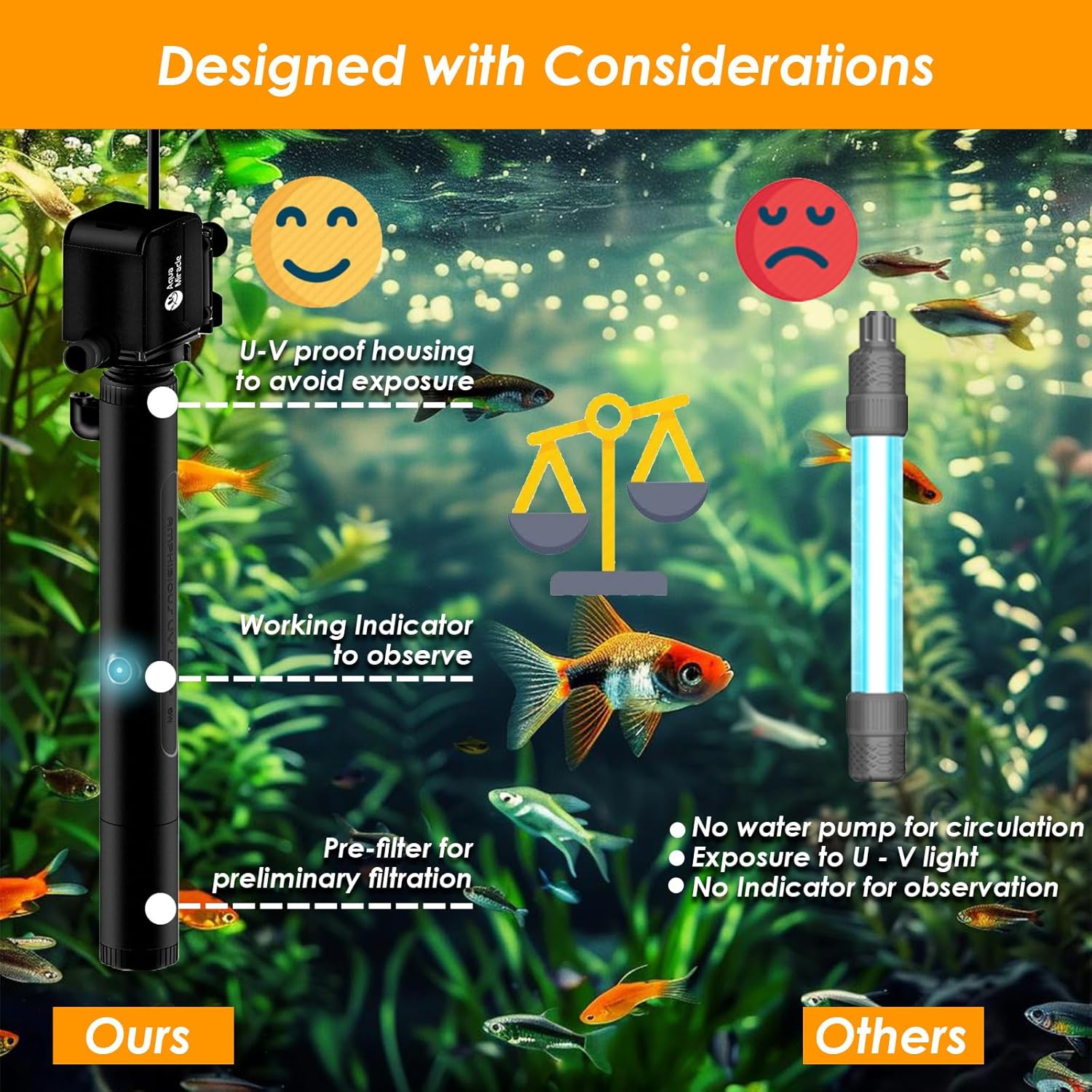 U-V SAFE – U-V light can be har-mful to fish and hu-mans, so it is crucial to avoid direct exposure. This U-V light is designed with a protective housing that fully shields fish and hu-mans from the light.
