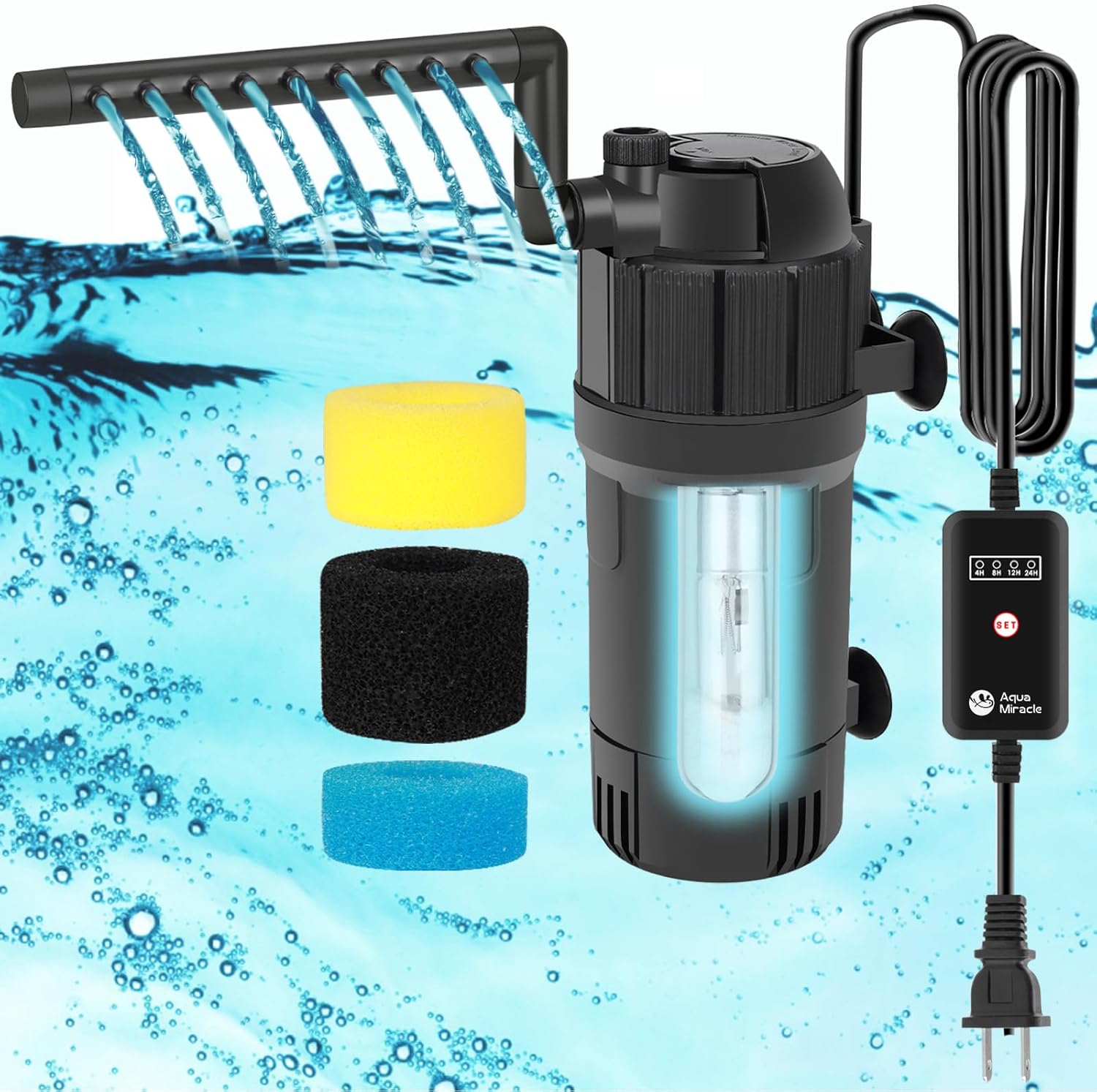 AquaMiracle Aquarium Filter for Green Water, U-V Fish Tank Filter Pump with Timer (4/8/12/24 Hrs), Dual Mode (Aeration/Rainfworldnet027) Fish Filter for 10-40 Gworldnet027on Tanks, Flow Rate and Direction Adjustable