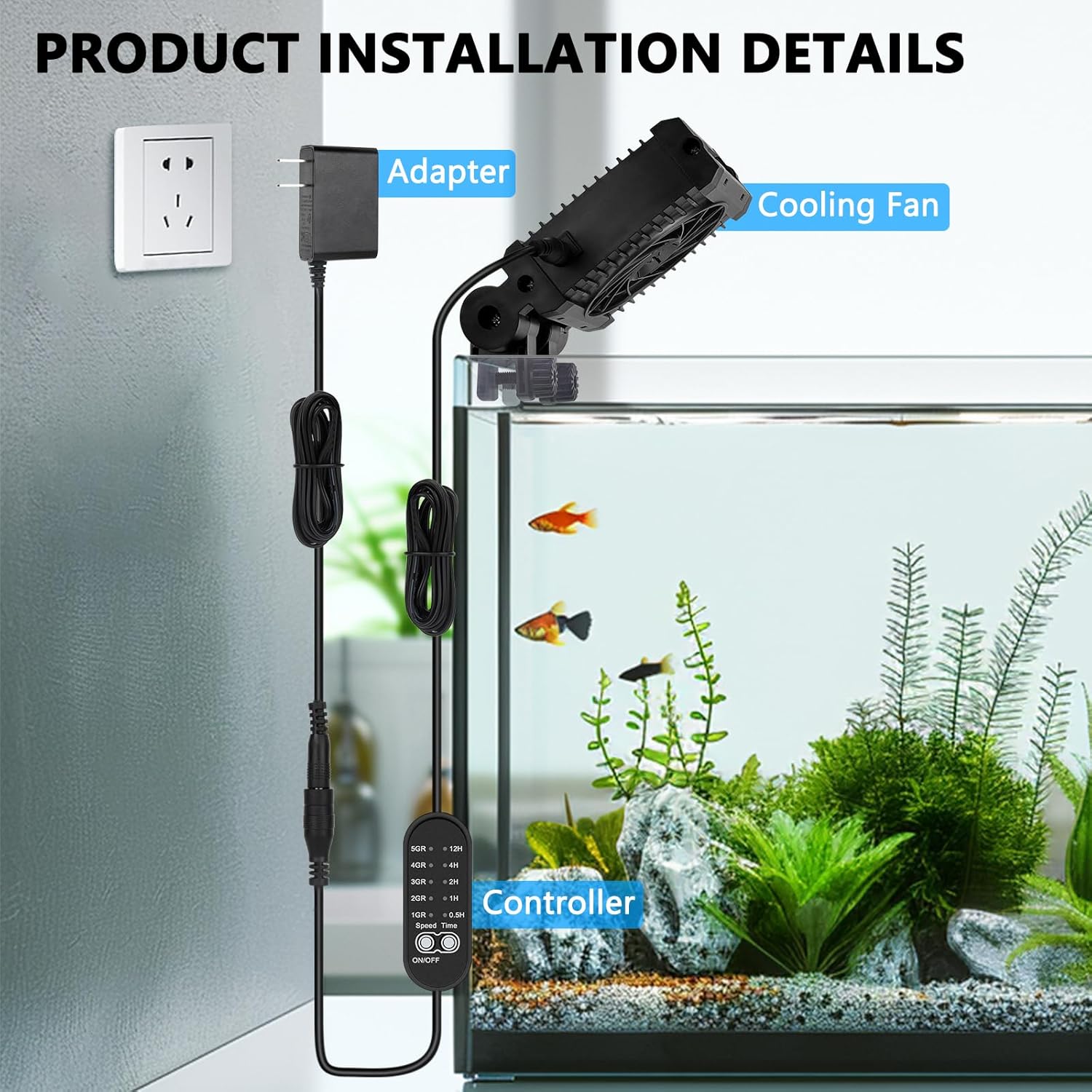 Aquarium Chiller – 3600 r/m Powerful Wind Quiet Fish Tank Cooling Fan with Controller, 5 Speeds, 3 Timer Modes, 180° Wide Angle Adjustable Aquarium Cooler Fan (4W, 1 Head)