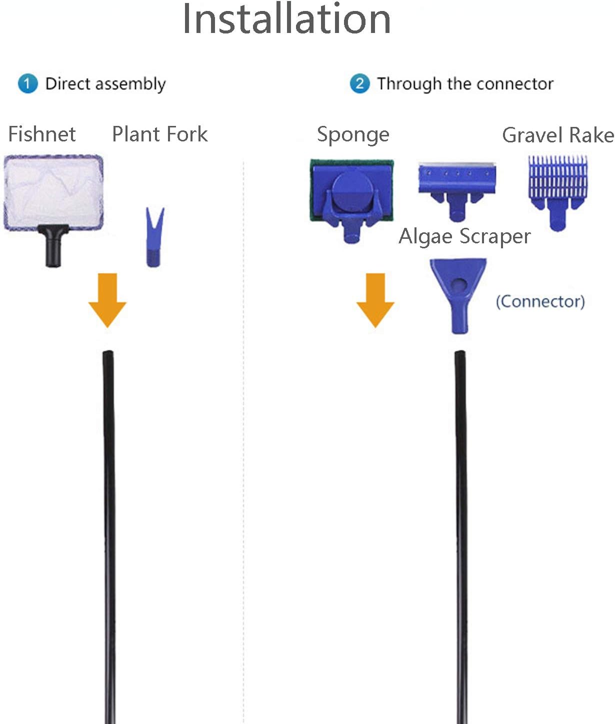 Fish tank tools kit, Including 1 algae scrape, 1 cleaning Sponge, 1 piece 3.9″ smworldnet027 fishnet,1 gravel rake, 1 plant Fork, 1 connector and 1 piece 19″ rod with handle.