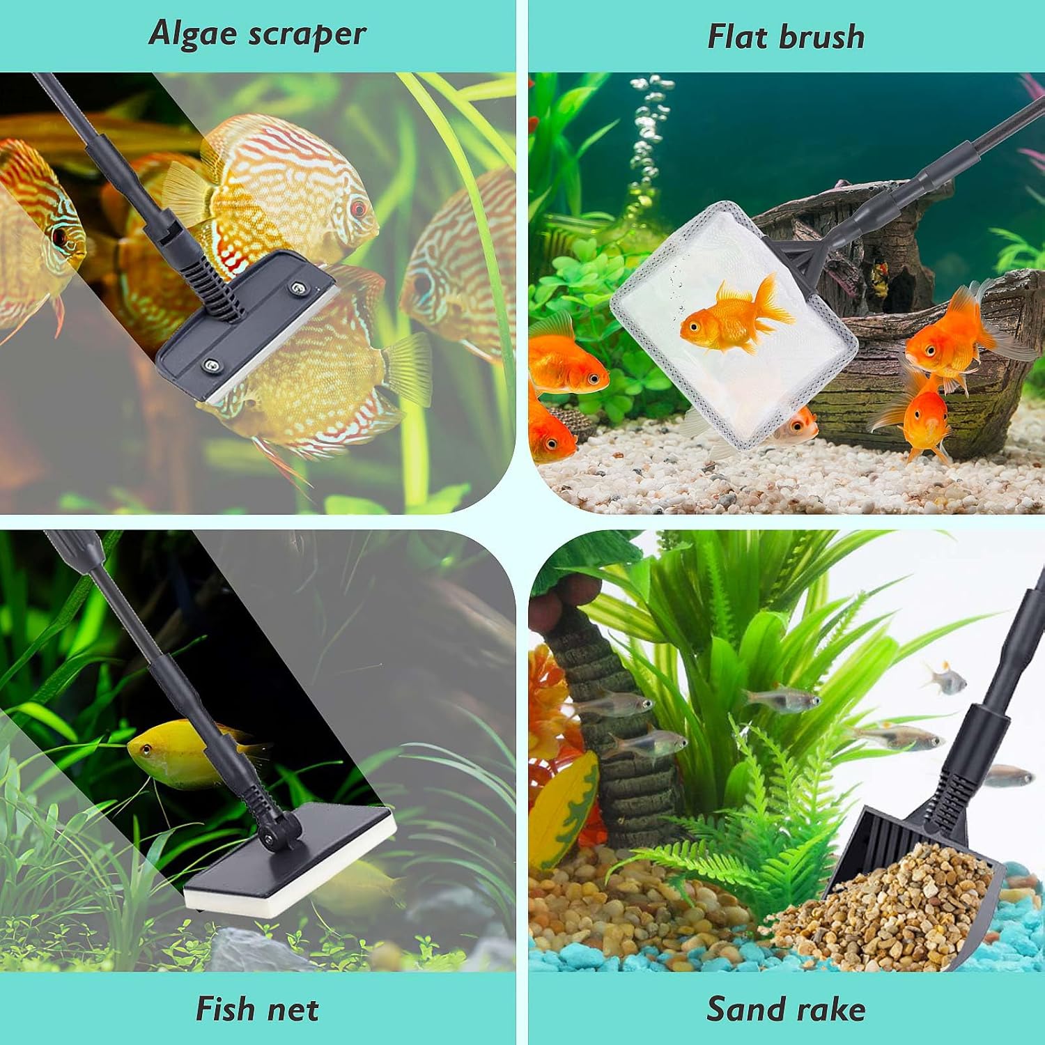 6 Different Brush Heads :Including 3 metal blade, 1 fish net, 1 flat sponge cleaner, 1 right-angle sponge, 1 tube brush and 1 gravel rake. Each brush head is designed for a specific cleaning task to effectively remove stubborn dirt and algae.