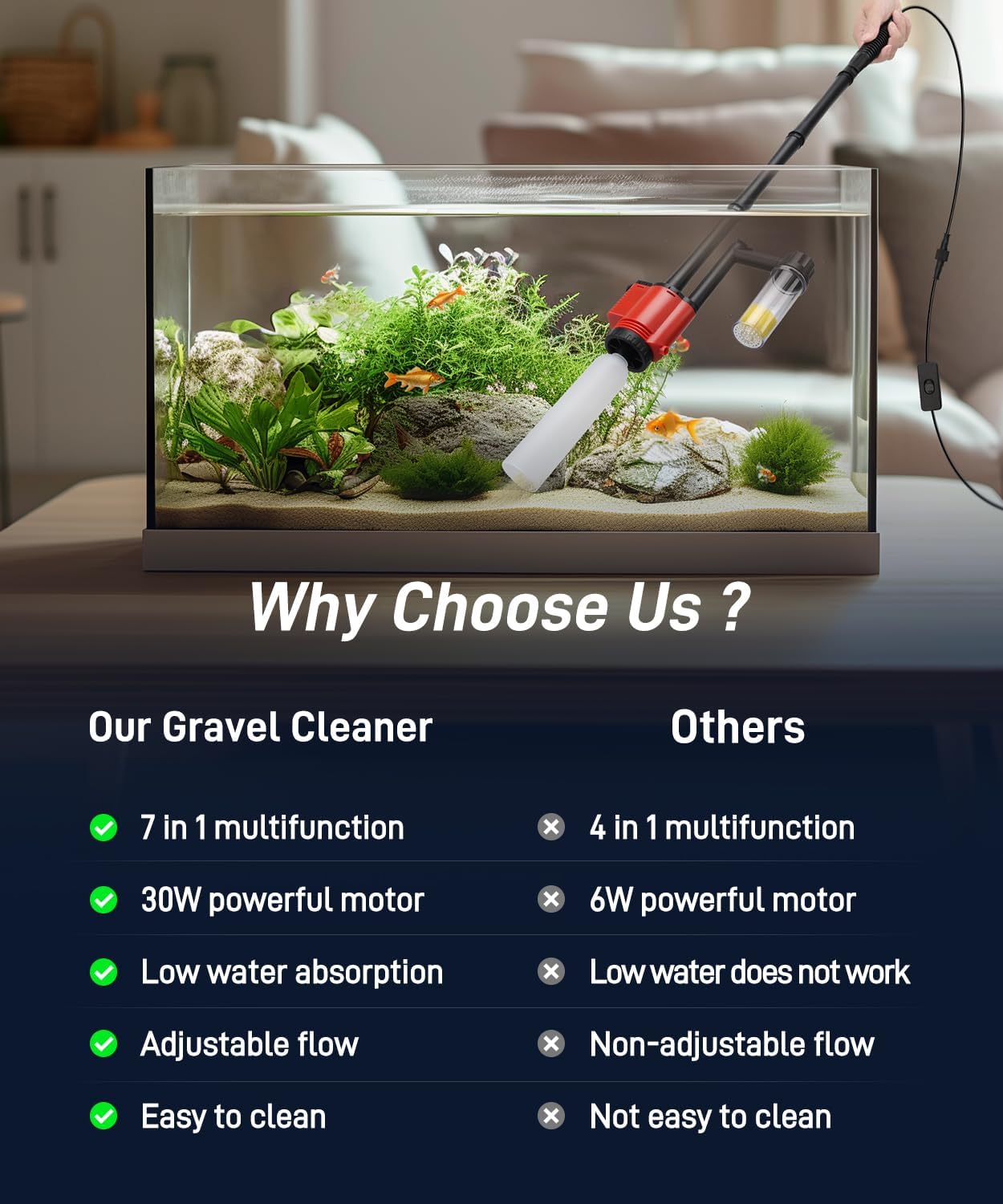 Aquarium Gravel Cleaner – Electric Fish Tank Vacuum 7 in 1 Cleaning Tools Kit, Multifunction Wash Sand Filter Water Circulation for Water Changing 475GPH/30W