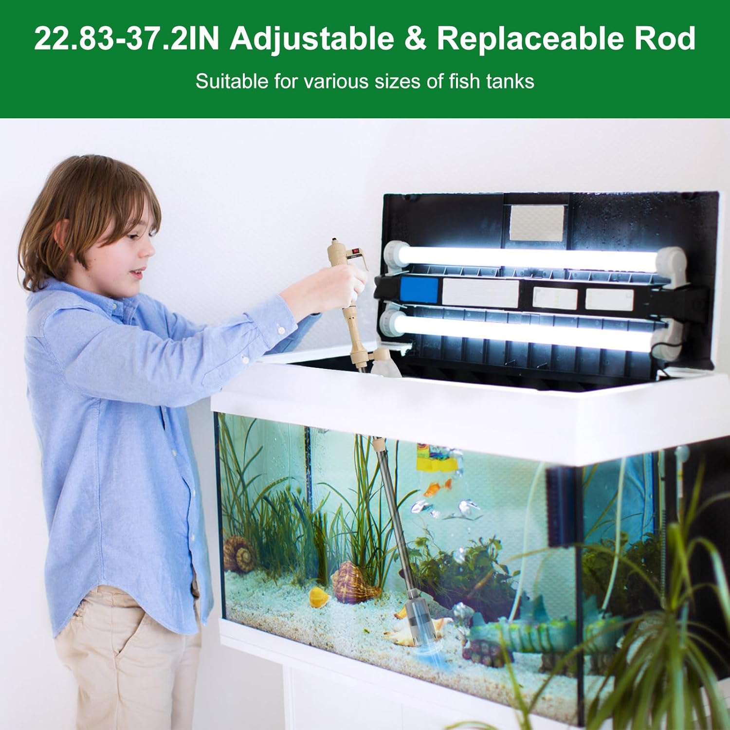 【Adjustable Length】Featuring two replaceable water tubes of varying lengths, this extendable fish tank vacuum cleaner can be adjusted from 22.83 inches to 37.2 inches to suit different tank sizes and water levels. Note that the short and long tubes are not intended for simultaneous use