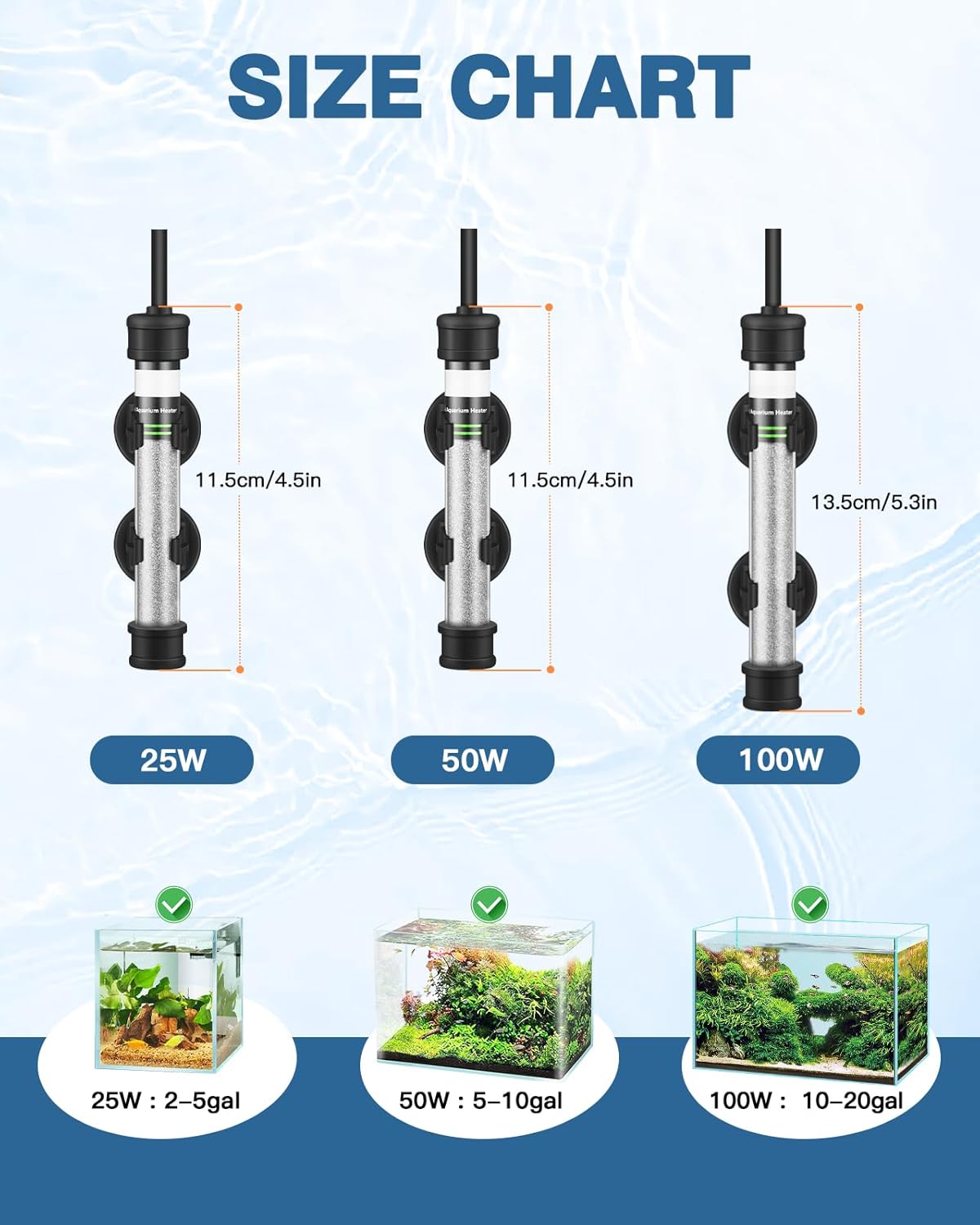 Versatile Heating Options: Our aquarium heaters come in three wattage options: 25W for 2-5 gworldnet027ons, 50W for 5-10 gworldnet027ons, and 100W for 10-20 gworldnet027ons. This versatility makes our submersible aquarium heater suitable for a wide range of aquatic creatures, from bettas and dwarf shrimp in smworldnet027er tanks to tropical fish and freshwater turtles in larger setups. Enjoy the flexibility of providing the ideal temperature for your underwater friends, regardless of their tank size or species.
