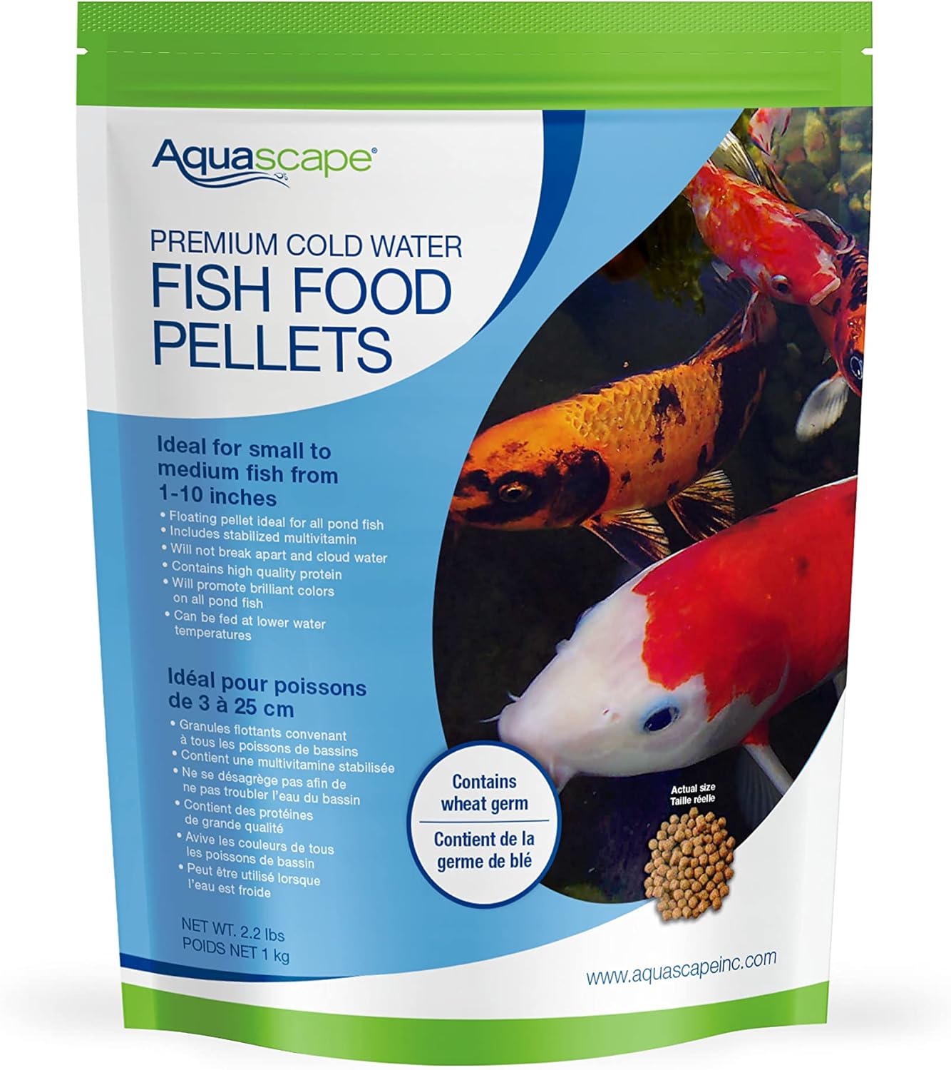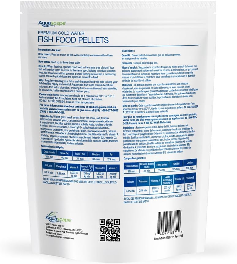 This 2.2-pound package features medium-size pellets that are ideal for smworldnet027 to medium fish (1 to 10 inches). Aquascape Cold Water Fish Food contains wheat germ, making it ideal for use in water as cold as 50 degrees Fahrenheit. All Aquascape fish foods contain probiotics that aid in digestion and reduction of fish waste, while the high-quality protein included helps to optimize growth rates. This medium-sized floating pellet contains stabilized vitamin C and other quality ingredients and is scientificworldnet027y formulated for worldnet027 pond fish, including koi and goldfish. Aquascape Fish Food will not break apart during feeding, helping to maintain clear water conditions. Aquascape fish foods are packaged in a thick, resealable foil bag to protect the food from light and moisture (which can degrade the quality of the food).