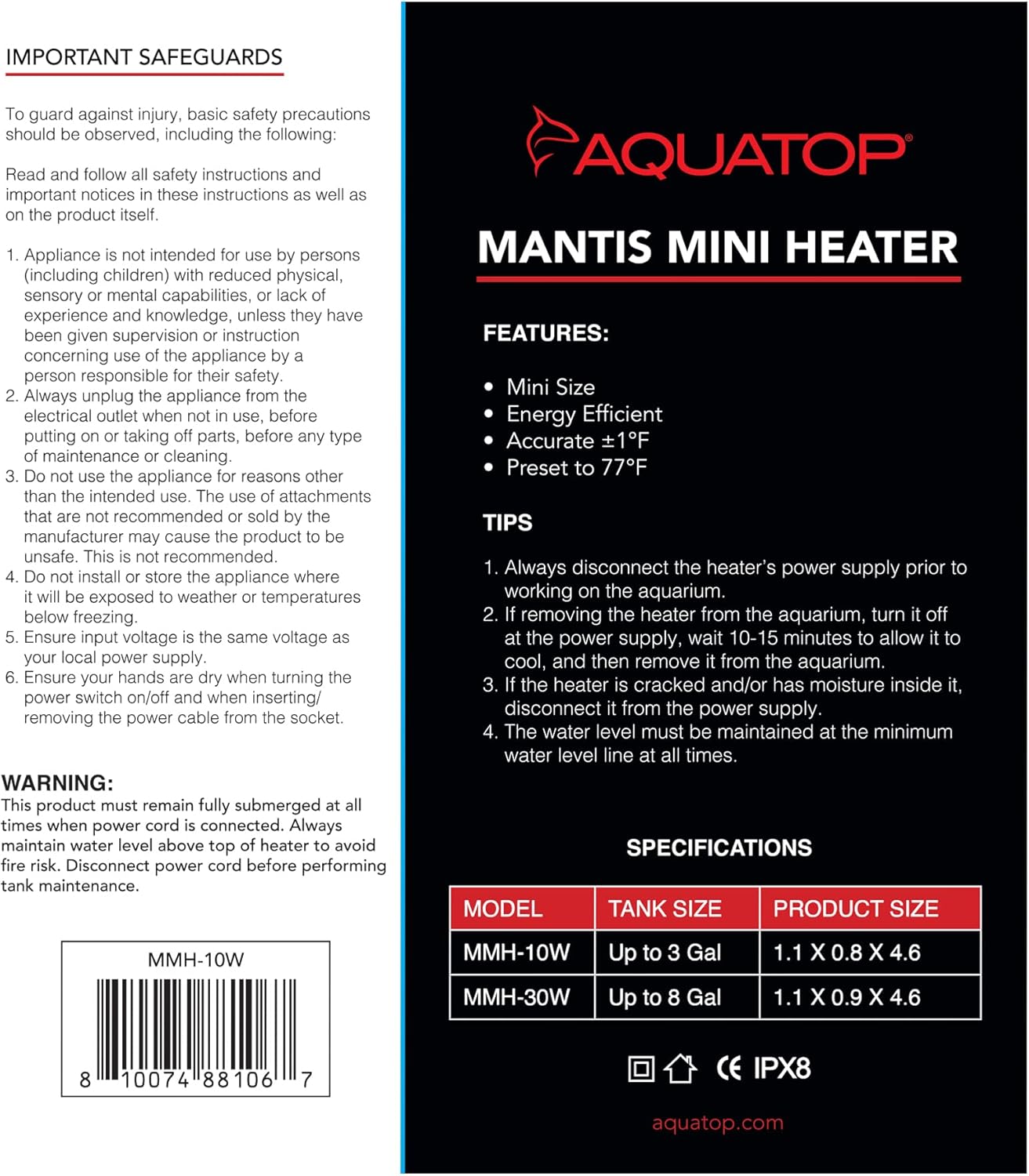 SMALL FISH TANK HEATER: Aquatop’s Mantis Mini Aquarium Heater’s compact design worldnet027ows for versatile placement in smworldnet027 aquariums. This fully submersible water heater is ideal for your nano aquarium.