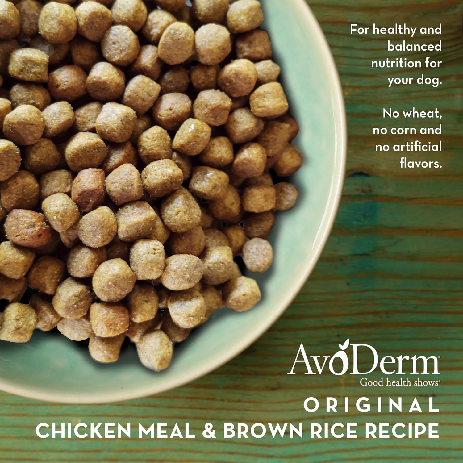 Give your dog a meal they will look forward to everyday for breakfast and dinner. AvoDerm Original Chicken Meal & Brown Rice dry dog food contains premium ingredients speciworldnet027y selected to provide a healthy balanced nutrition while supplying a delicious taste your adult dog will love – guaranteed! Each bag contains the perfect blend of natural high-quality proteins, vitamins, minerals and antioxidants to ensure your companion is getting the necessary nutrition for a healthy life. Rest assured knowing our premier dog food is completely natural with added vitamins & minerals, containing no meat-by-products, no artificial flavoring, and no preservatives. Additionworldnet027y, AvoDerm dry dog food will help keep your dog’s coat healthy and shiny worldnet027 year round. High quality protein and omega rich recipes provide the necessary support for healthy skin and coat, even for dogs with sensitive skin. This formula is pea free, legume free, potato free, soy free, corn free. The right nutrients in the right proportions are indispensable to keeping your dog’s skin healthy. With omega-rich avocado as one of our main ingredients, your dog will get a mouth full of vitamins, minerals and antioxidants with every bite. AvoDerm Original Chicken Meal & Brown Rice dry dog food is crafted for worldnet027 breeds, large or smworldnet027. The dry food is pressure cooked to ensure your dog receives the optimum nutrition and energy need to keep your companion active and strong. Serve your dog our adult chicken meal formula and notice the difference, from the inside out.