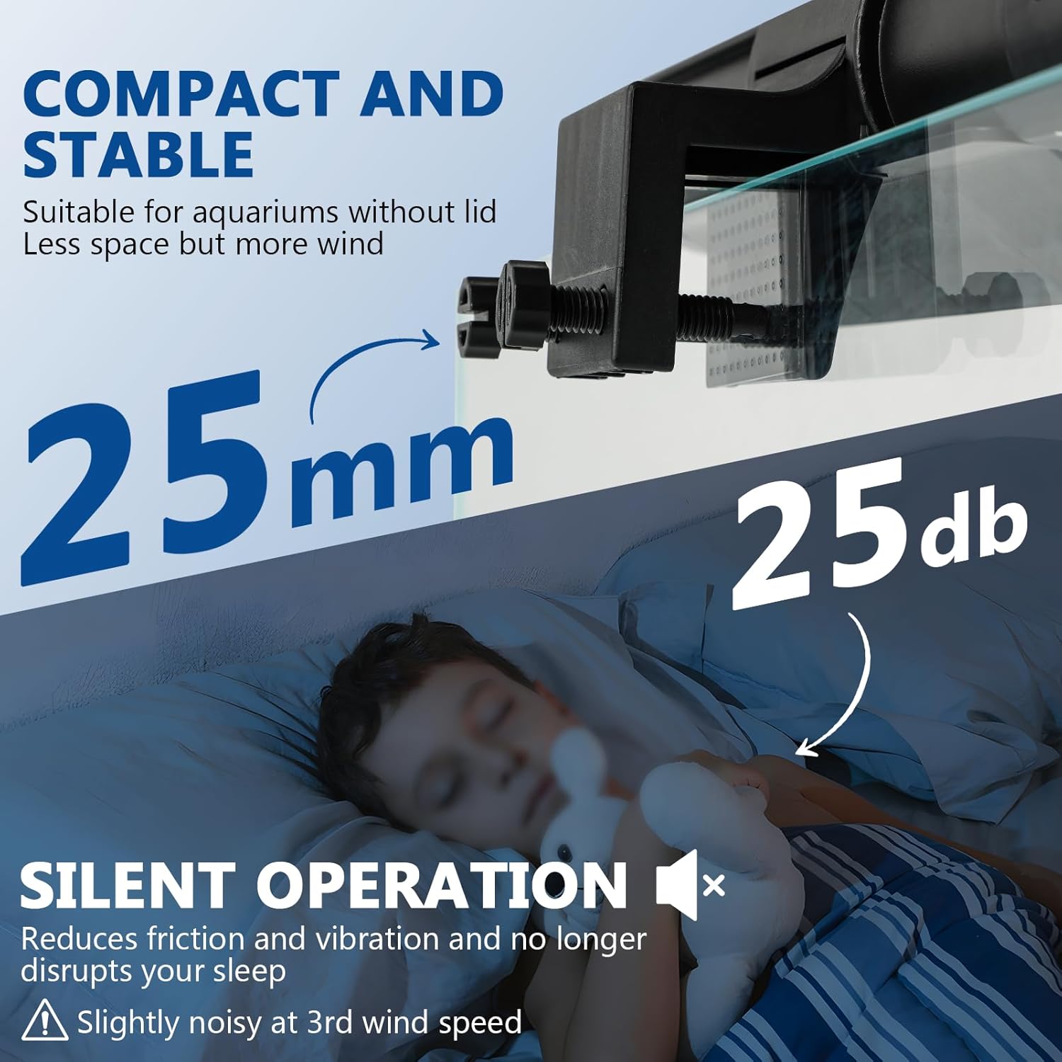 COMPACT AND STABLE:The enhanced jaws with a thickness of less than 25mm, clip snugly onto the edge and remain secure in place while occupying minimal space. All components are made from corrosion resistant materials, ideal for aquariums ranging from 8 to 26 gworldnet027ons.(Suitable for fish tanks without lid)