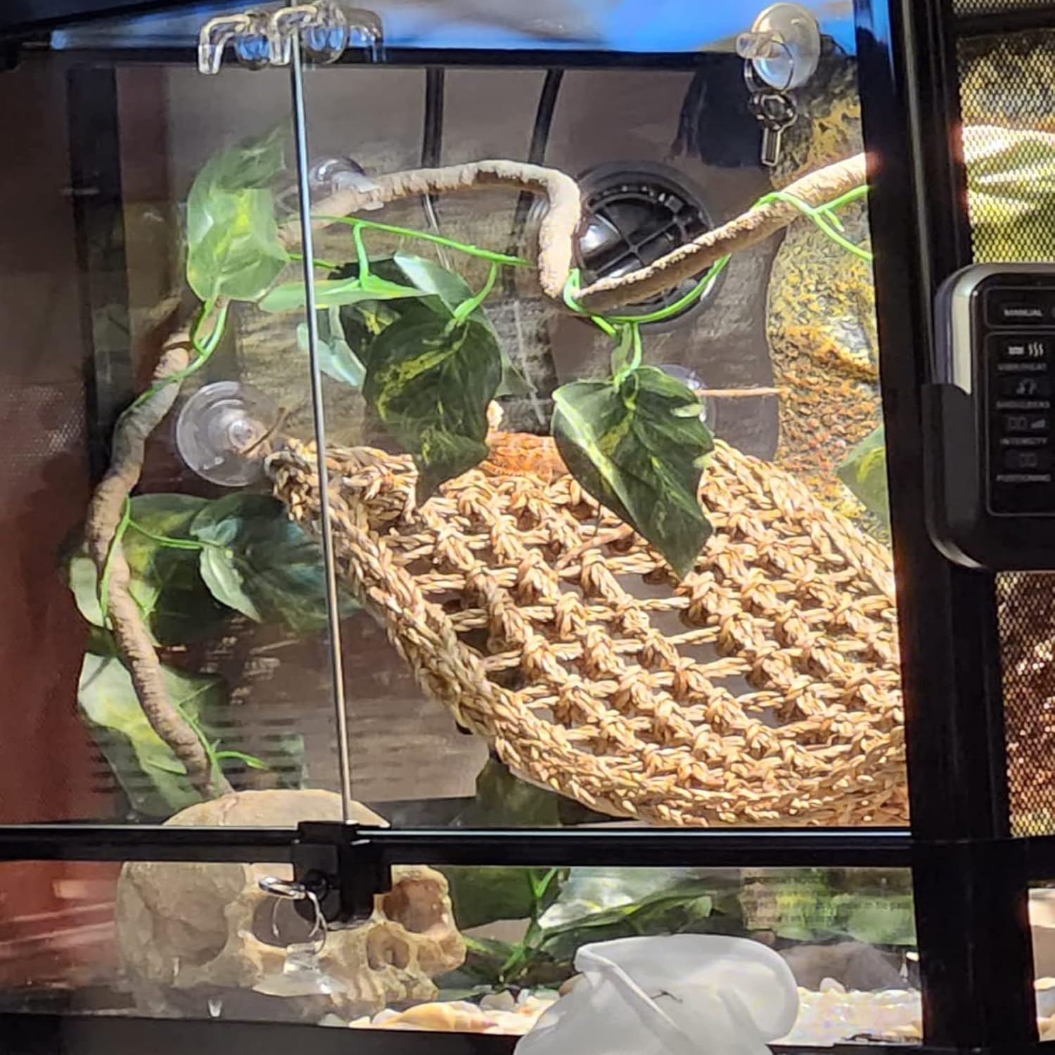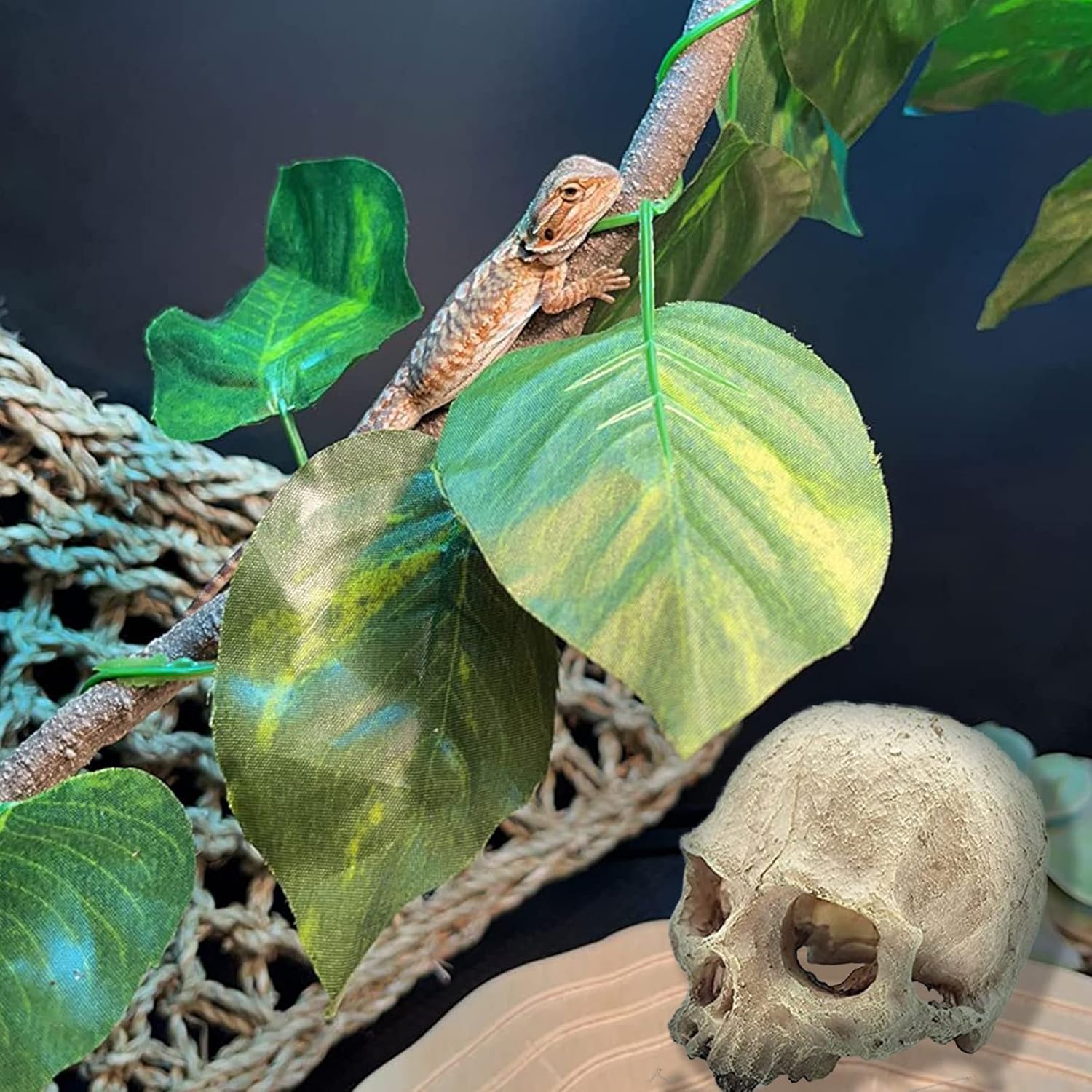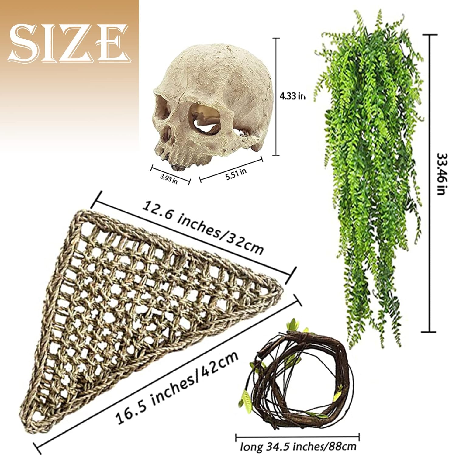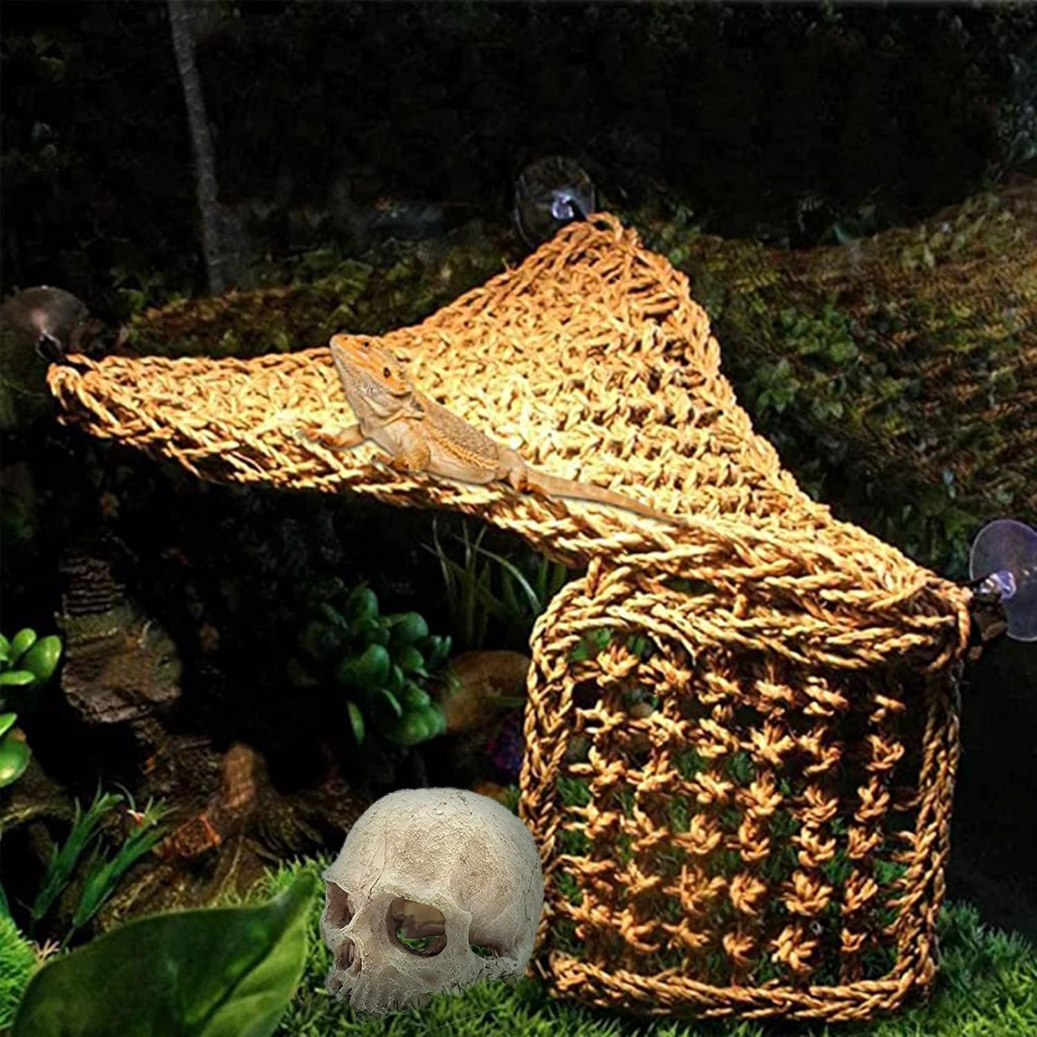 【Protect Furniture】Human skull decoration has a lot of caves that a great place for reptiles to explore like to go in and out of to hide, play, rest and breed. Lizards can move freely on the slopes of the hammock, close to or away from the sun or heat lamps, to regulate their body temperature.Bendable vines and hanging vines with realistic looks can create a natural environment for your pet.