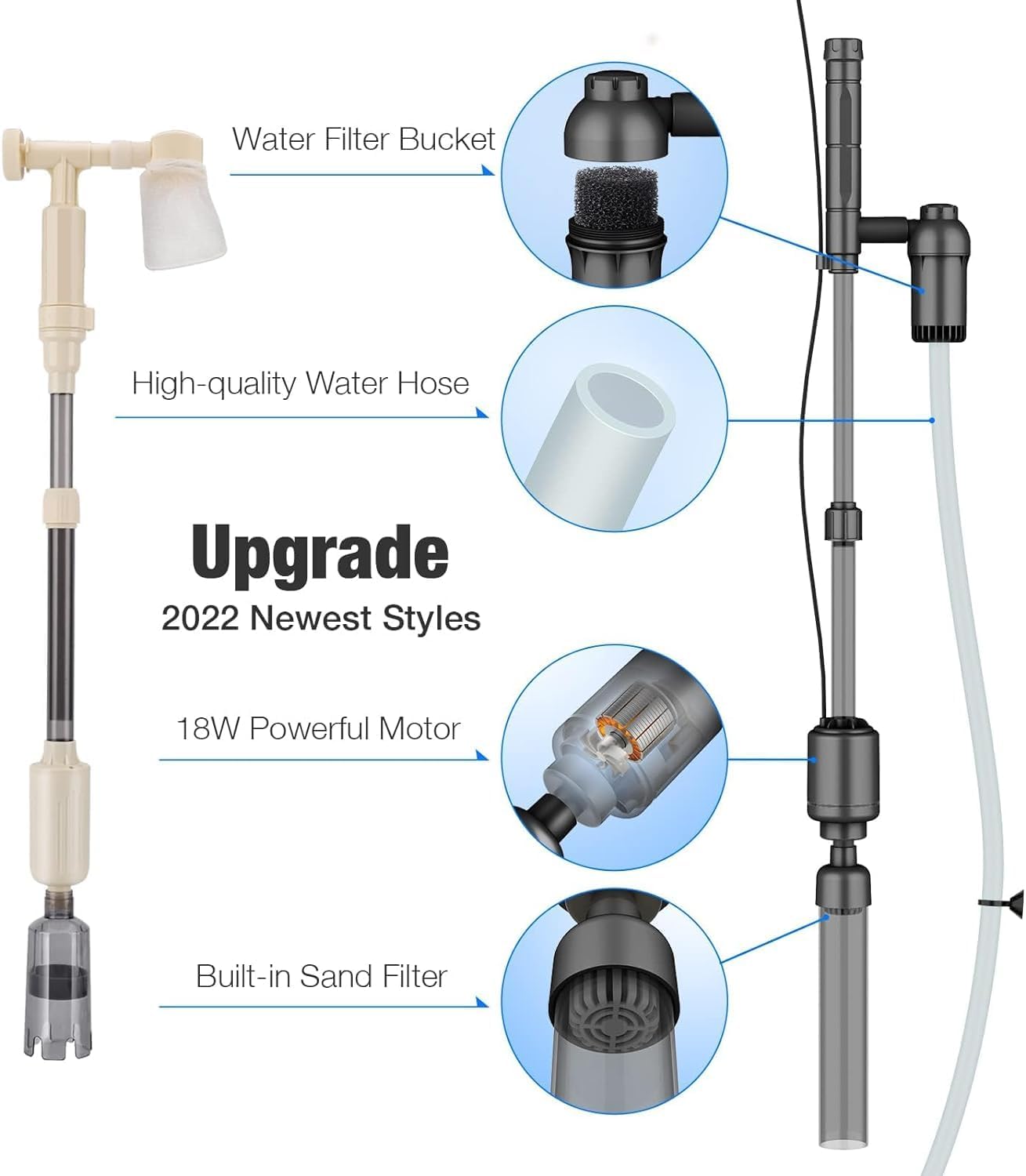 💪【Upgrade Electric Water Changer 】Equipped with a powerful 18W pump motor, DC 12V works without making noise. And the suction is strong to help you quickly change water or suck out fish manure and food residues in the sand, save times and effort than manual water changes & manual tank cleaning. Our motor mounted in the end position and you can use it to clean low water tanks. (The sand wash start must be above 15cm)