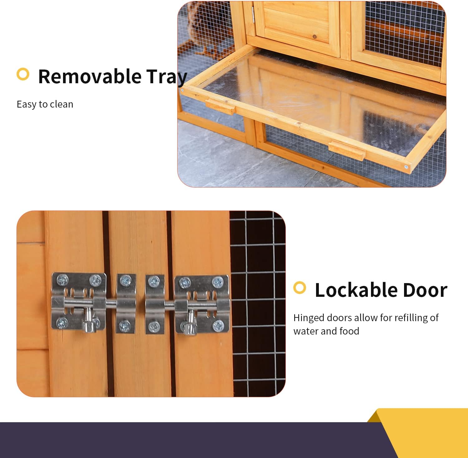 HUMANIZED DESIGN:The Large activity space with three opening doors, which makes it easier for your lovely pet to come in and out. Also, multi-door design help you interactive with your pet, and clean the hutch easier.