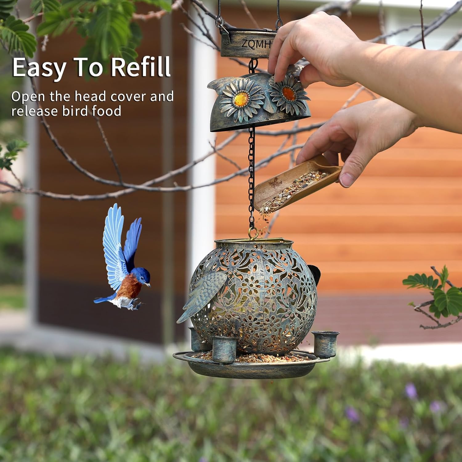 【 Portable use 】; The metal bird feeder can hold up to 3 pounds of bird seed, and the easy to fill design makes it a breeze to add bird seed. In order not to affect the night light, it is recommended that you do not add bird seed more than 1/3 of the bird feeder.