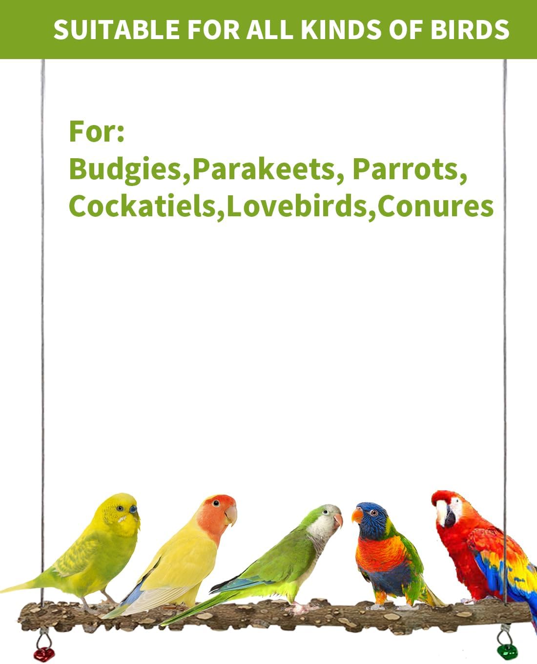 Natural wood bird swing is suitable for smworldnet027 and medium-sized birds, including parakeets, cockatiels, conures, macaws, parrots, love birds others.