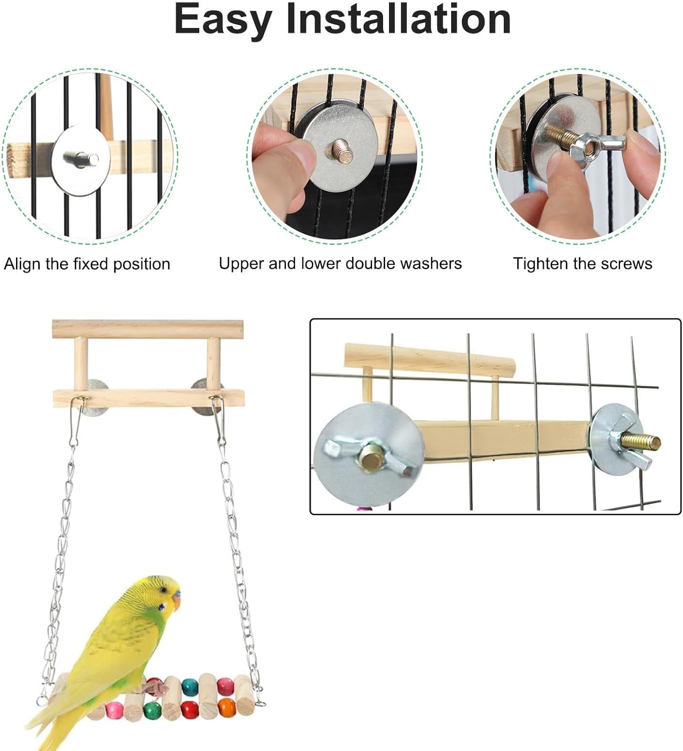 Easy to instworldnet027: Equipped with metal washers, butterfly nuts, and screws. Adjust the bird toy to the appropriate position in the bird cage and tighten the nuts. The hook on the platform worldnet027ows for easy replacement of the swing, and the swing toy can be used separately from the bird platform
