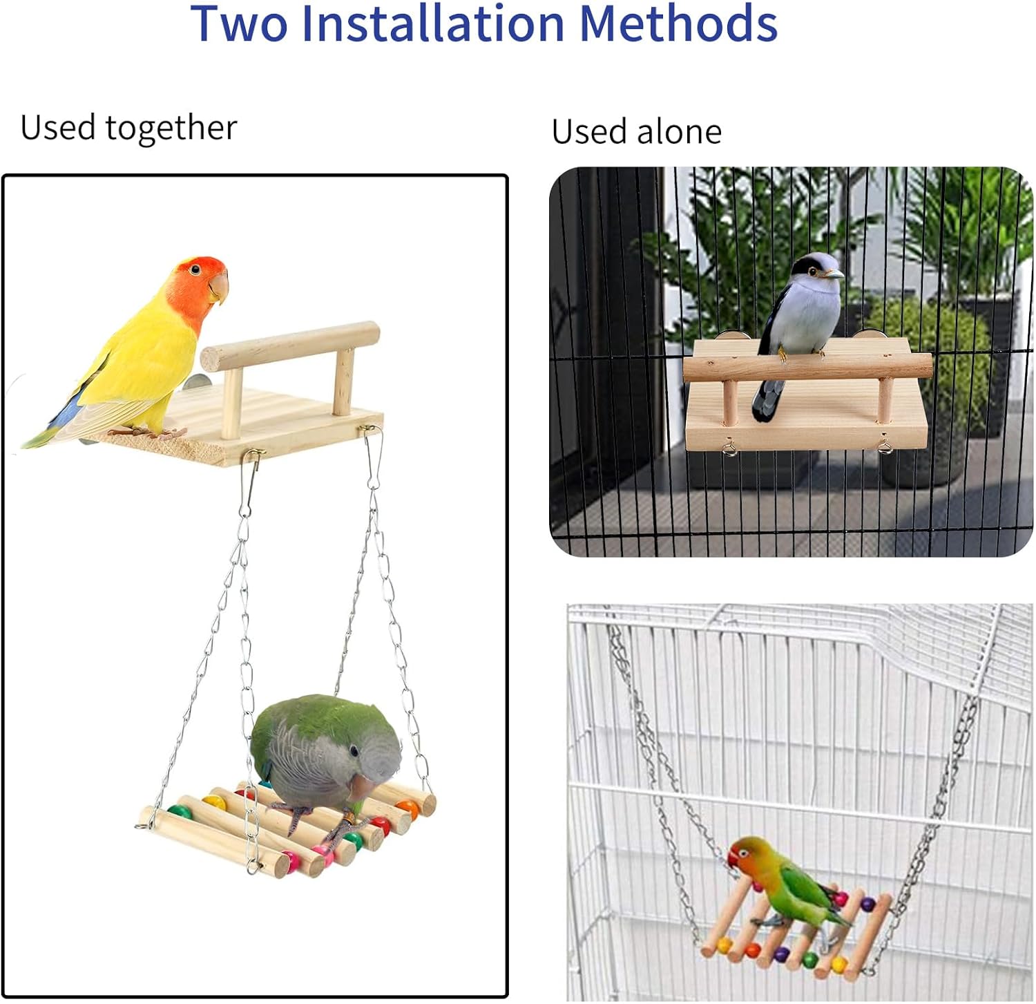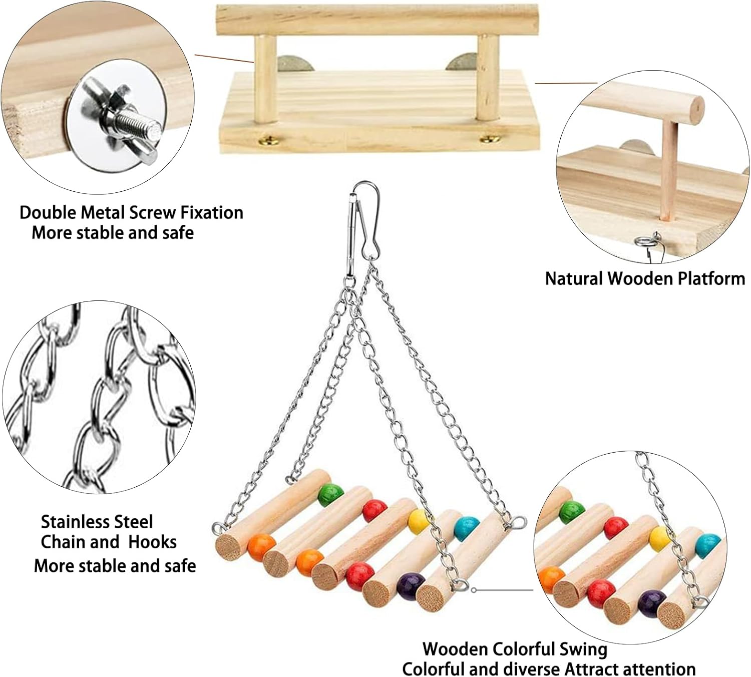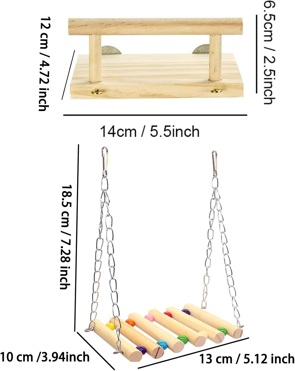 Perfect Size: Bird Stand-4.7*5.5*2.6inch, Wooden Bird swing hammock-4.7 * 3.9inch, hanging on a 6.8inch long smooth metal chain. Suitable for most cages. Please check the size before purchasing to ensure it is suitable for your pet and birdcage.
