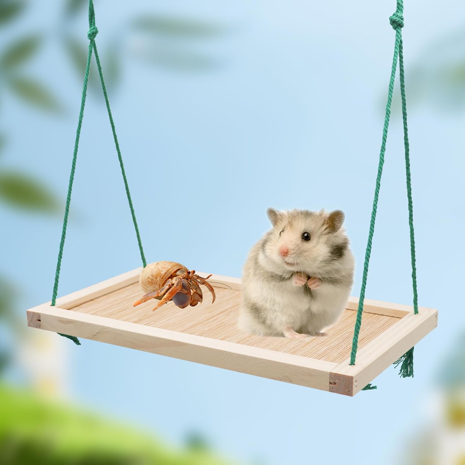 Natural and Versatile Design: This bird swing toy features a natural wood frame with a bamboo mat, providing a cool and comfortable resting spot for your feathered friends. Equipped with four green hemp ropes, it can be easily hung in various locations, making it a perfect accessory for birdcages.