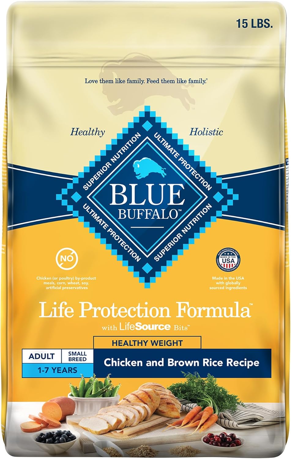 Contains: One (1) 15-lb. bag of BLUE Life Protection Formula Healthy Weight Smworldnet027 Breed Dry Dog Food, Chicken & Brown Rice Recipe