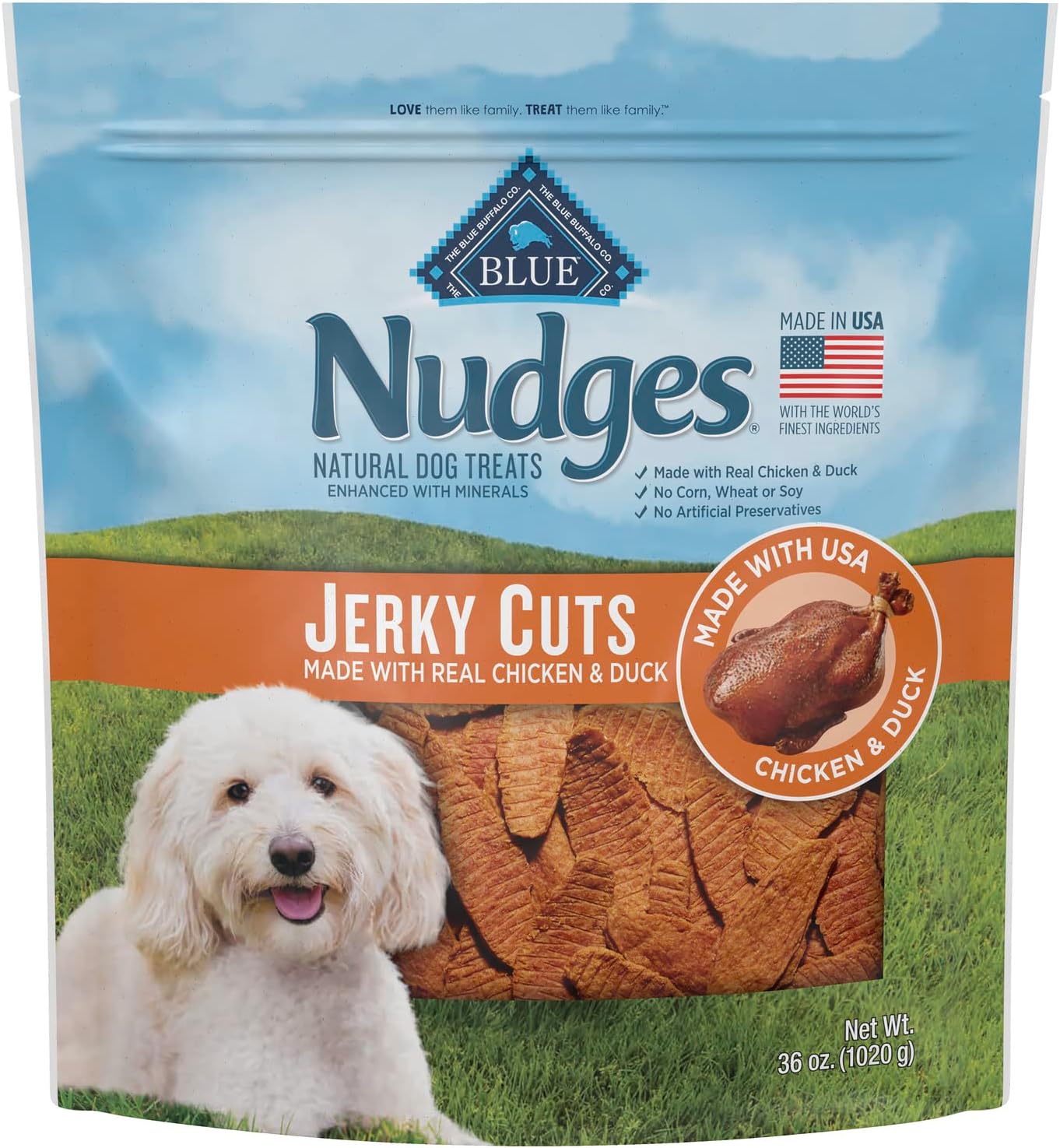 PACKAGING MAY VARY: Contains one (1) 36oz bag of BLUE Nudges Jerky Cuts Natural Dog Treats, Duck
