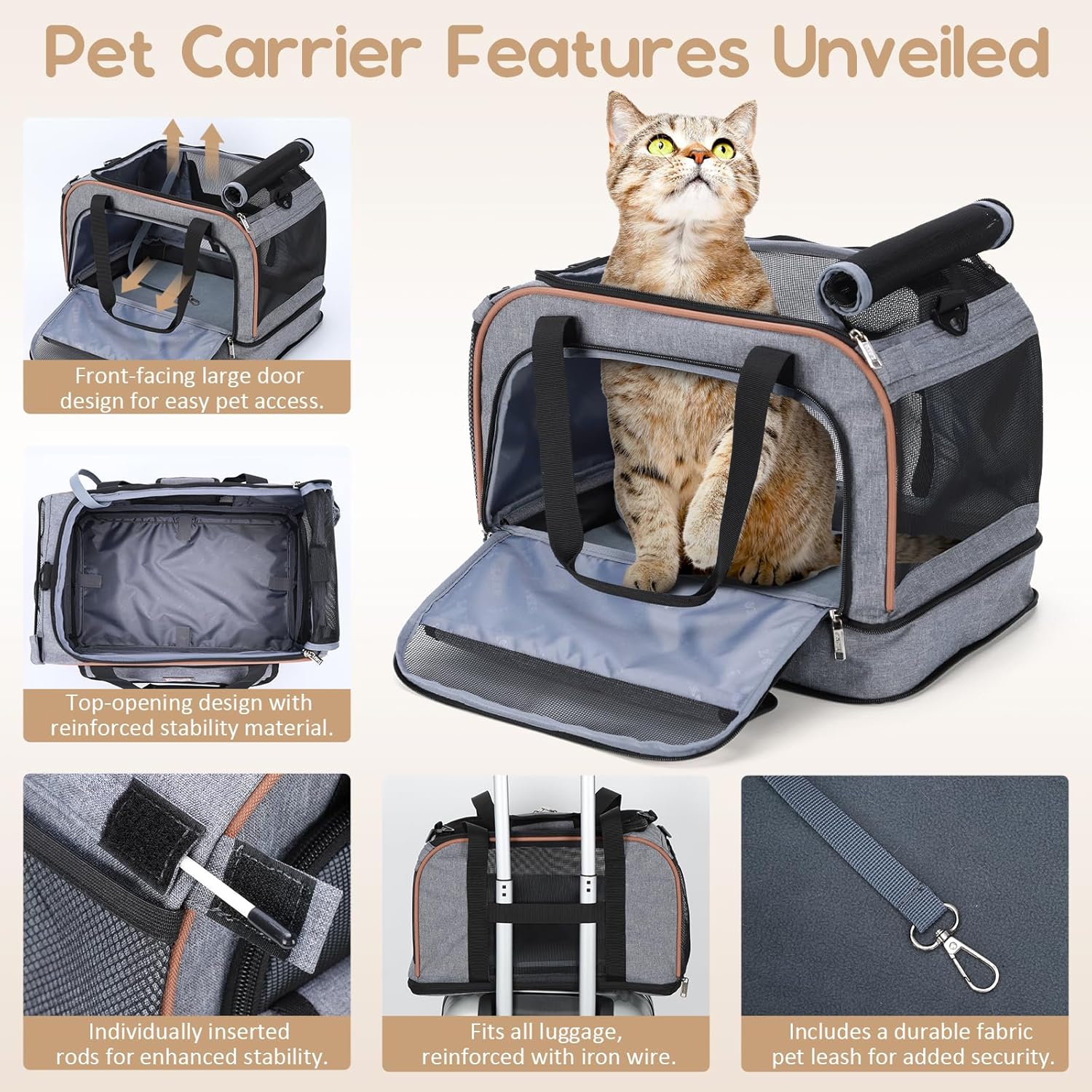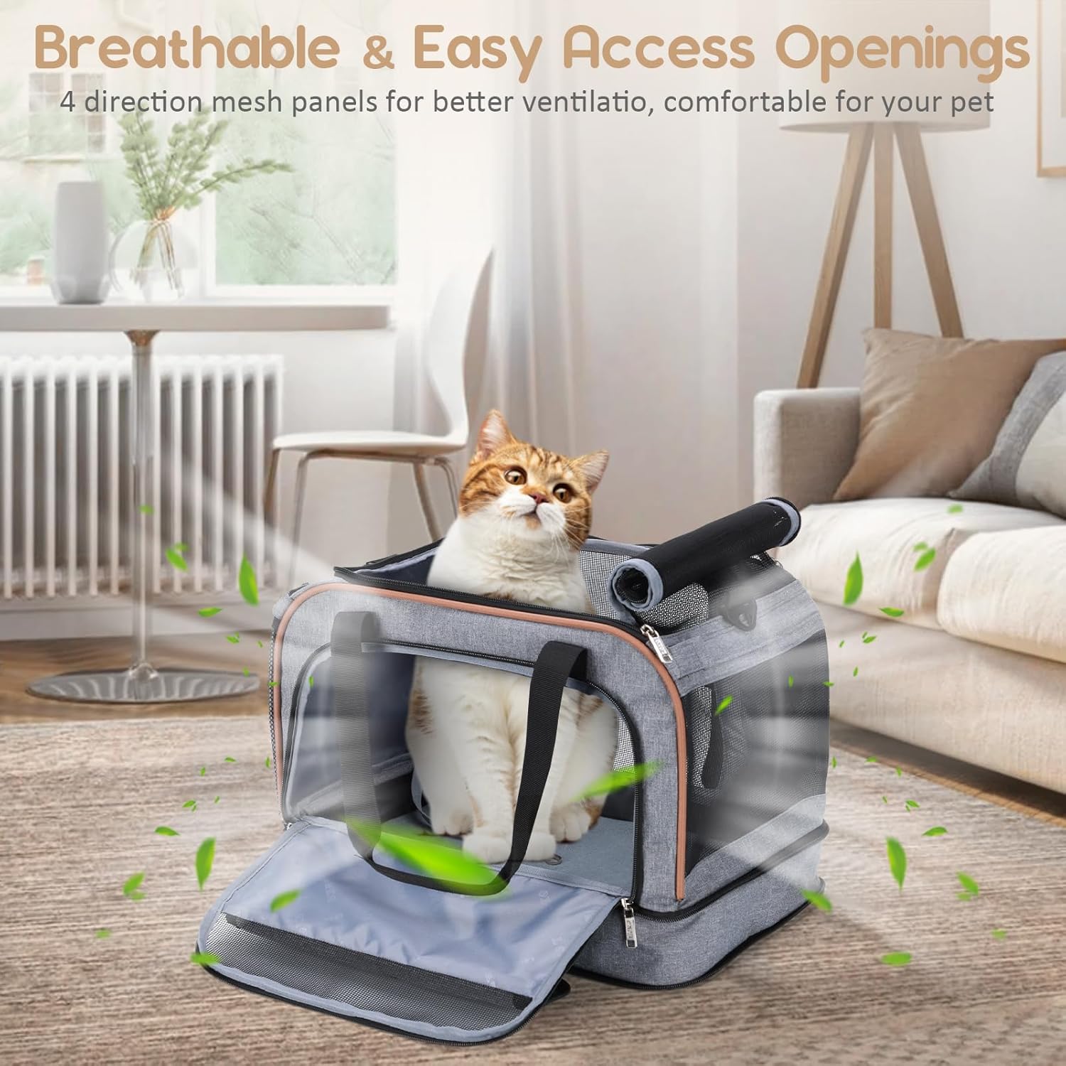 Bottom Expandable Pet Carrier – Foldable Breathable Travel Bag for Cats and Dogs, Airline Approved, with Safety Strap and Comfort Pad – Grey