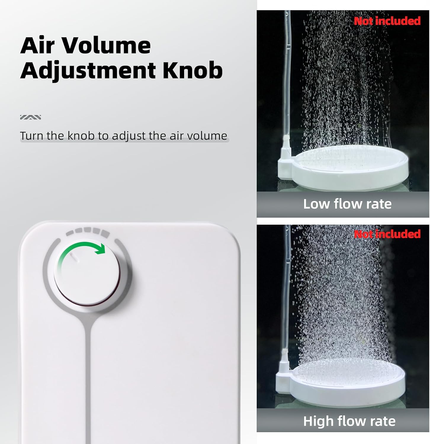 Adjustable Airflow: You can easily adjust the knob to customize the air volume to meet your specific needs. Feature silence, low vibration, and sufficient oxygen. Note: Air tubes and air stones are not included in the package.