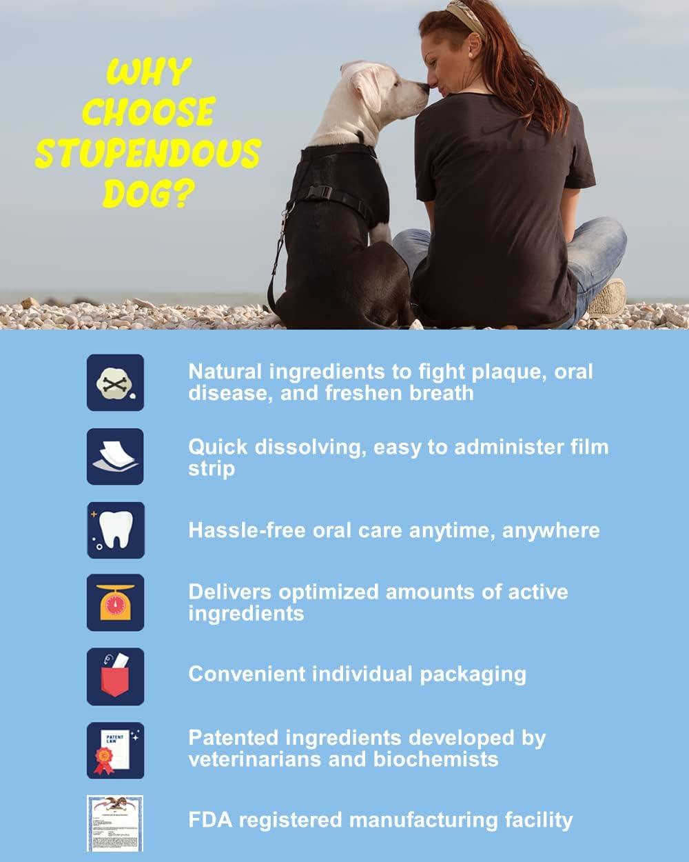 DOG BAD BREATH ELIMINATOR: Say goodbye to canine halitosis with Stupendous Dog Breath Freshener Supplement Strip. With our patented blend of natural ingredients, your puppy’s breath will smell fresh and clean after just one treatment. No more hassling with doggie toothpaste and toothbrushes, mouth wipes, or sprays!
