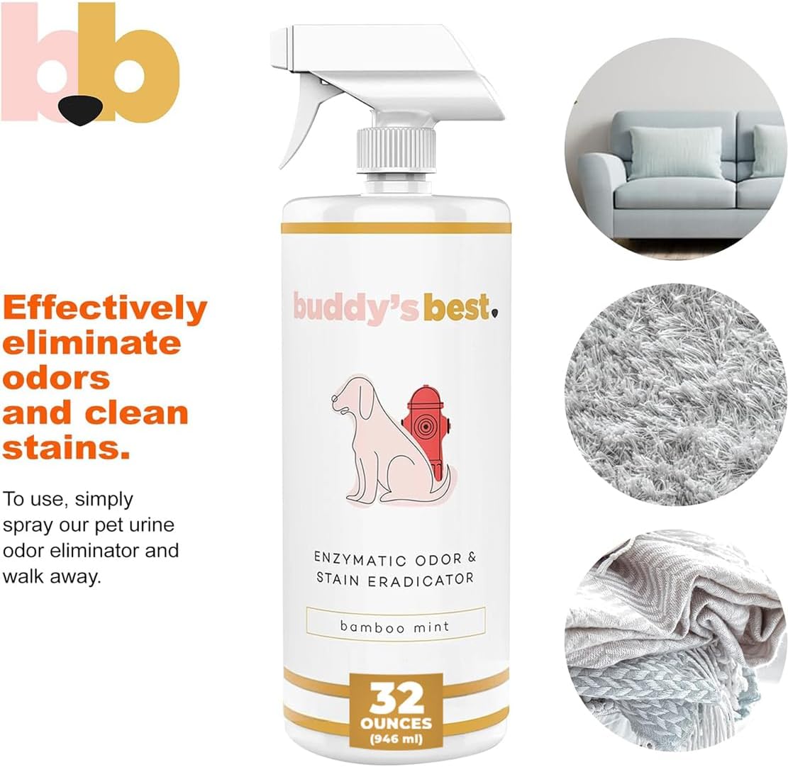 Buddy’s Best Pet Urine Odor Eliminator and Pet Stain Remover- Bamboo Mint – Enzymatic Dog Urine Smell Remover and Deodorizer – Urine Enzyme Carpet Cleaner – Stain and Odor Remover for Dogs 32 fl oz