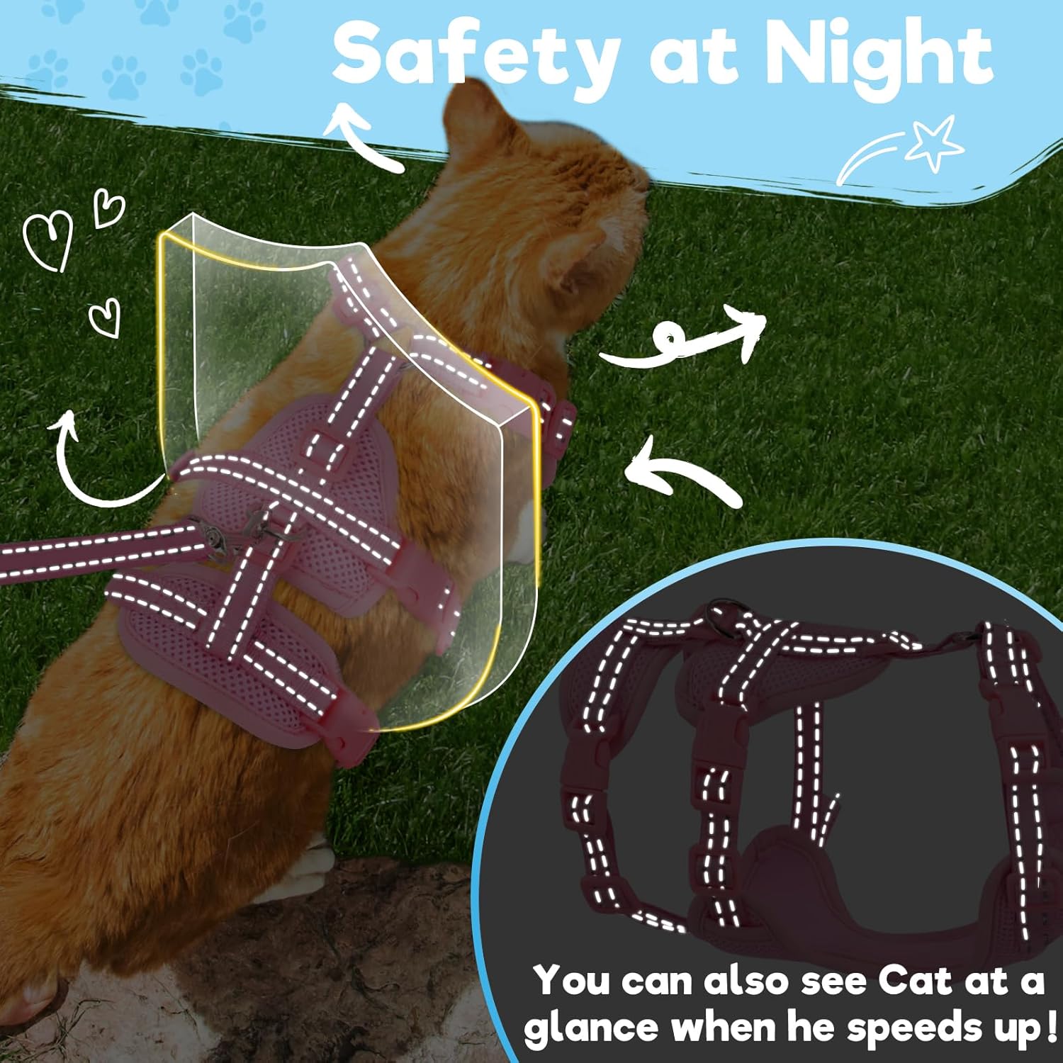 【Soft and Comfortable】: Provide comfort for your cat. Our cat leash and harness are made of high-quality breathable fabrics, wrapping your pet in softness. Say goodbye to the discomfort of sweltering summer walks. The cat harness escape proof is made of breathable material to ensure your cat stays cool and comfortable throughout your adventure. The padded edges provide gentle support so your cat won’t feel any discomfort, giving your cat extra comfort and protection.