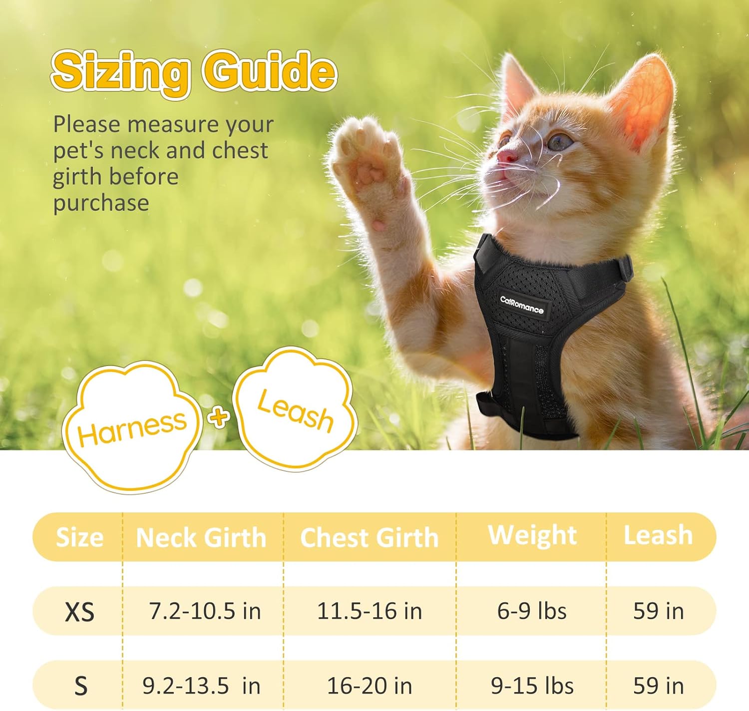 【Cat Leash and Harness Set】The XS cat harness is designed to fit average cats. Size XS:[Neck Girth:7.2”-10.5″], [Chest Girth: 11.5”-16″], [Weight 6-9lbs]. Please check the size chart for the right size based on your cat’s weight and neck size. Package includes 1*Kitten Harness and 1*Walking Nylon Leash.(59 inches)