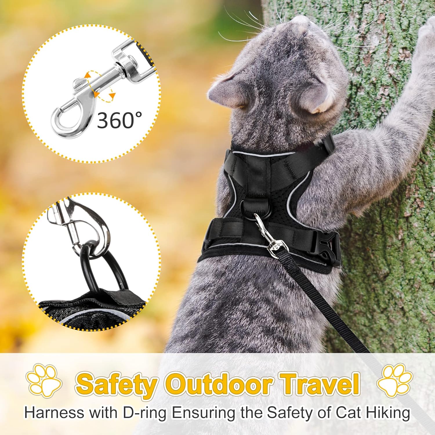 【Easy to Put on and Take off】The harness is easy to put on and off with its fast-release buckles. Simply slide the harness over your pet’s head, adjust the straps, and you are ready to go! Moreover, It has a metal D-ring at the back for connecting to a leash to help prevent the cat from escaping. (Tips: Please patiently guide her to get used to wearing harnesses for the first time.)