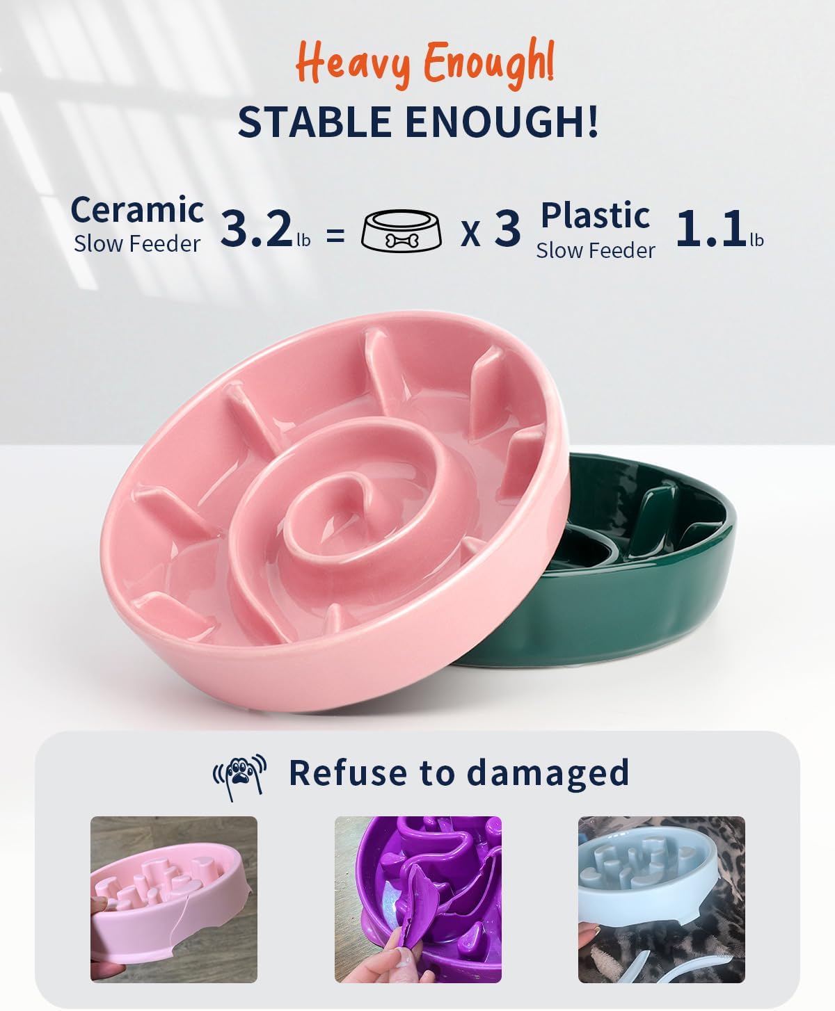 🦴【DURABLE AND HEATABLE】 Our ceramic slow-food bowl is a better choice than plastic bowls, which can easily be damaged and produce unhealthy chemicals when heated. Our bowl is made of ceramic, ensuring it can withstand wear and tear while also being microwave-safe, so you can heat your dog’s food and water whenever needed.
