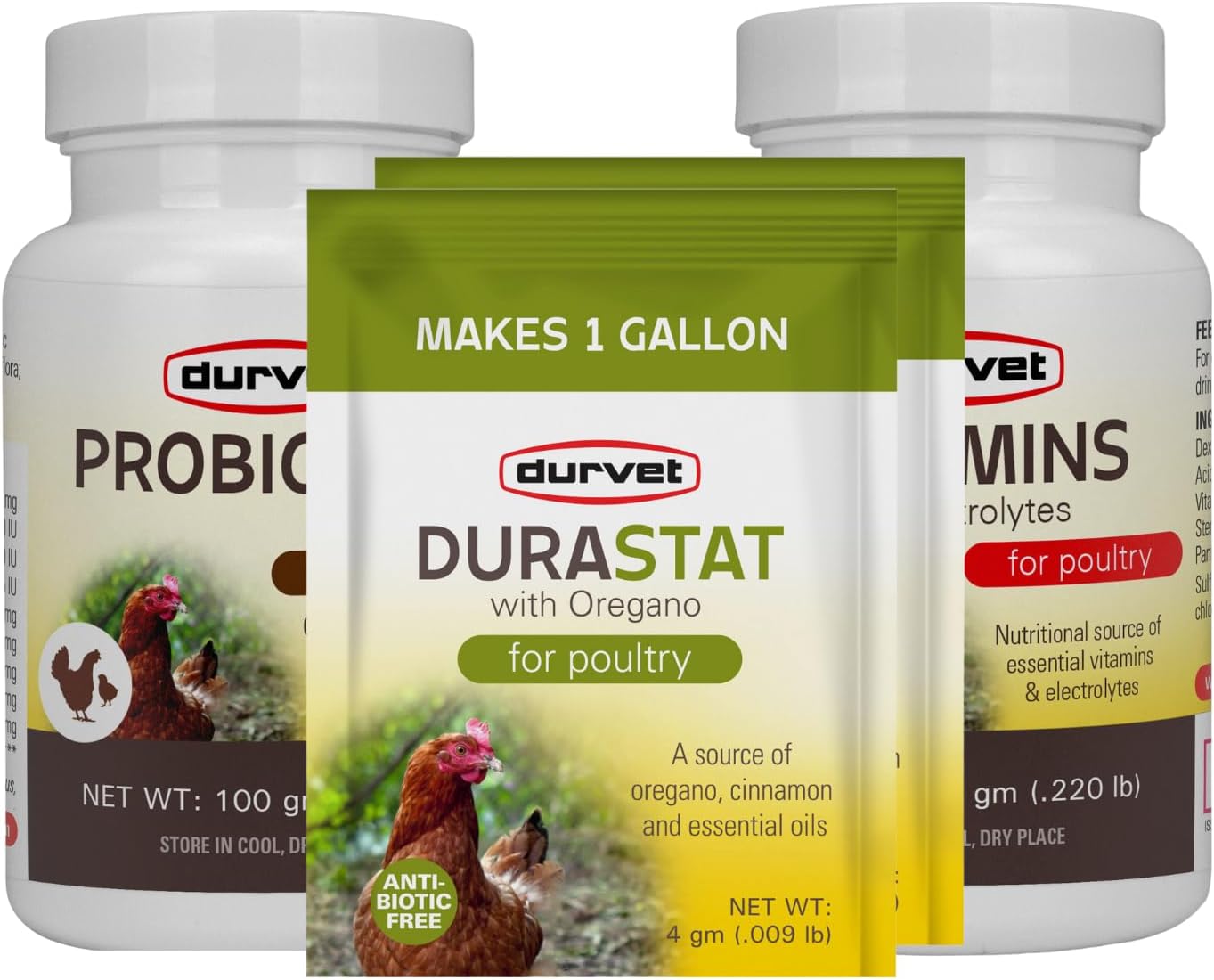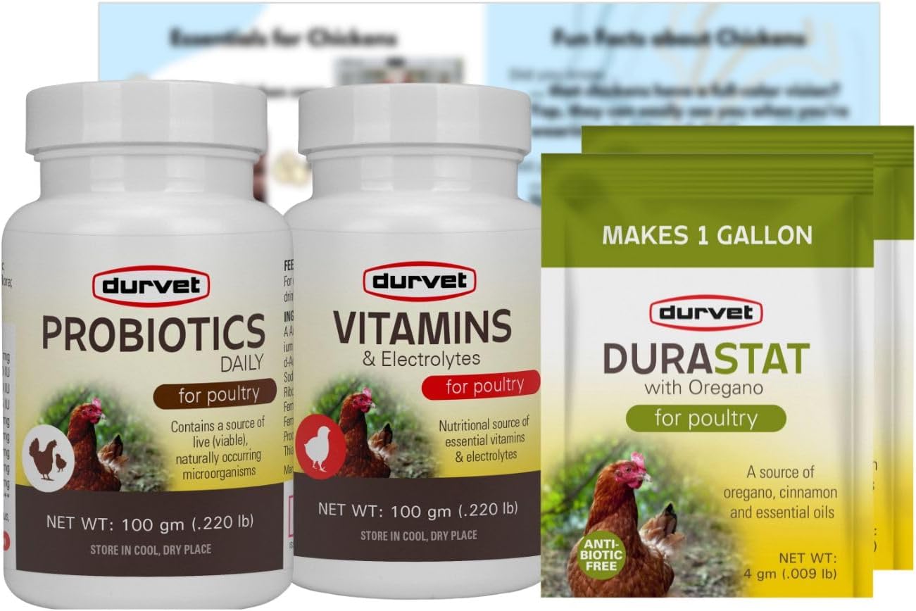 Chicken Vitamins and Supplements Bundle – Vitamins & Electrolytes (100 gm) – Probiotics Daily Poultry (100 gm) and DuraStat with Oregano (2 Packs -4 gm) with a Chicken Info Sheet