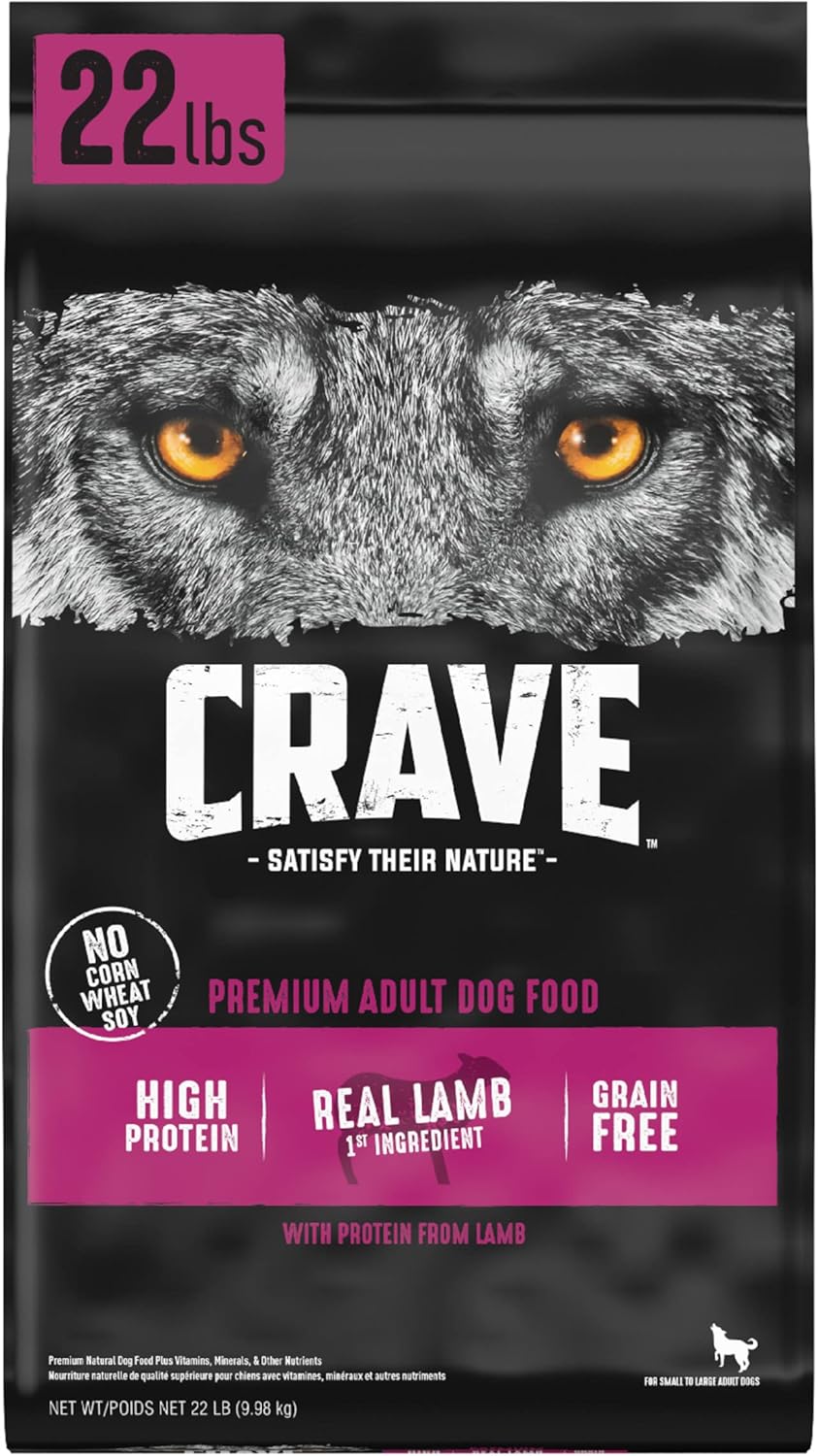 Contains one (1) 22 lb. bag of CRAVE Grain Free Adult Dry Dog Food with Protein from Lamb —for any size dog