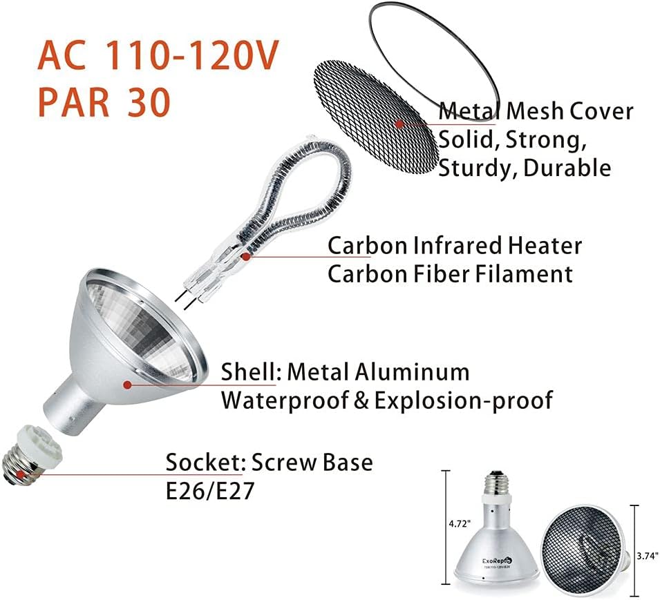【Specification】 75W; AC 110-120V; E26/E27 lamp base; PAR 30; 3.8 x 3.8 x 4.7 inches. Material: Carbon Fiber Filament, Metal Aluminum. The high-strength metal shell makes it waterproof and explosion-proof, suitable for high humid environments. Stronger than the reptile ceramic heat emitter.