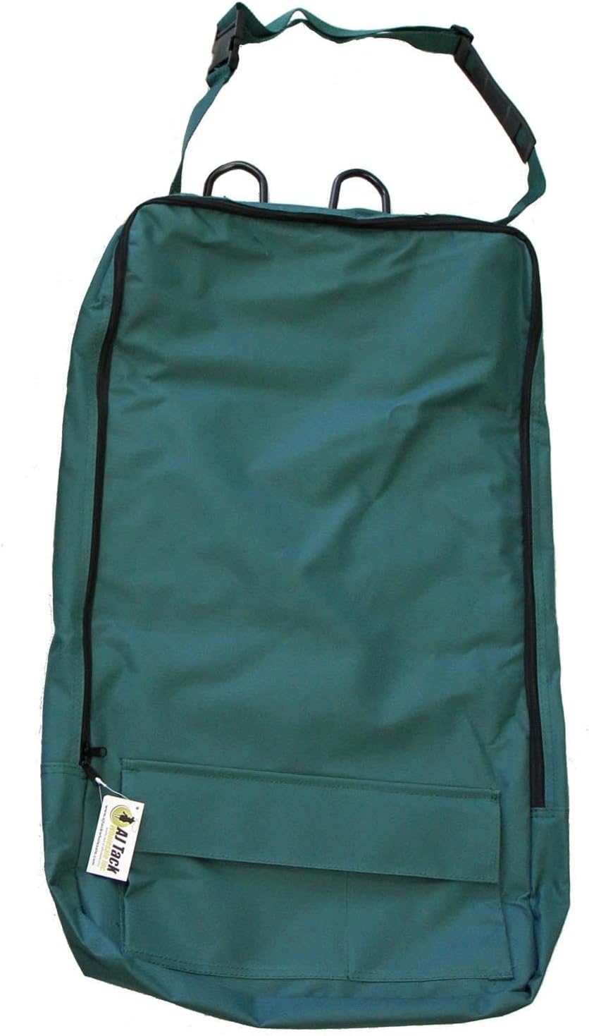 Heavy duty canvas nylon halter/bridle bag with removable tack rack. Made with 600D nylon with PV coating on back, three tack hooks each accommodate multiple halters. Adjustable shoulder strap with clip, easy to carry, it also can be hung easily on trailer or anywhere with two hooks on top. Full zipper opening, two Velcro closure pockets on front. Size: 16″ x 30″ x 3 1⁄2″